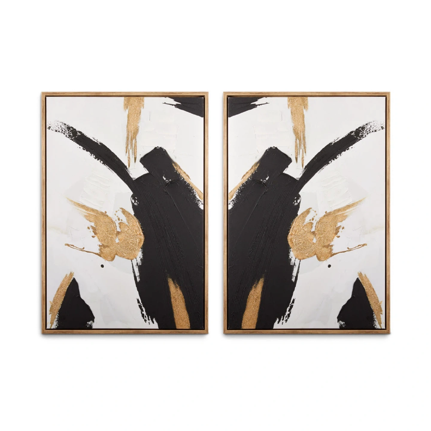 Selling a beautiful piece of abstract wall art. It features a striking design with black, white, and gold accents, all framed in a light wood-tone frame. This artwork would be a great addition to any room!
