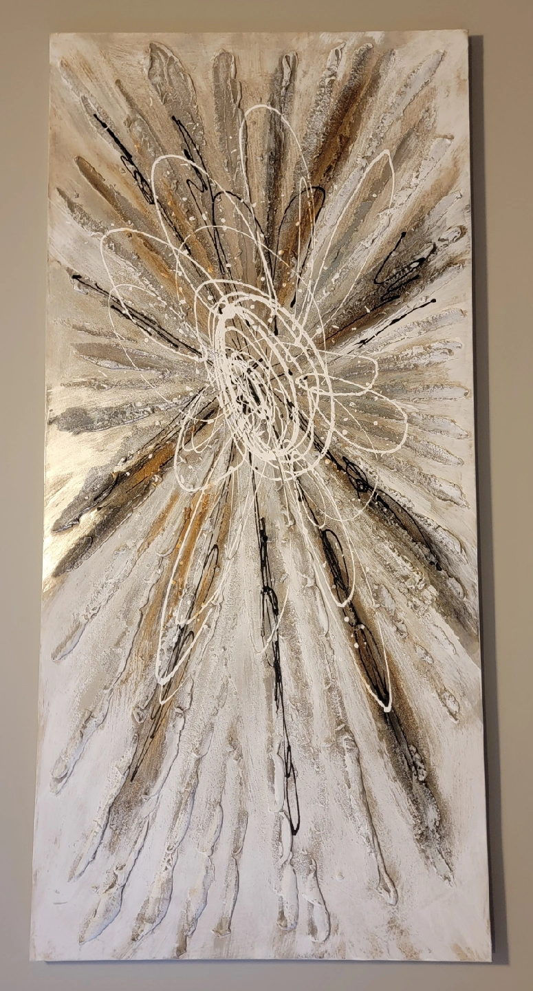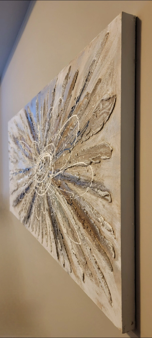 Add a touch of modern elegance to your home with this abstract flower wall art! The neutral colour palette makes it easy to match with any decor. Great condition and ready to brighten up your space Dimensions: 60.5 x 27.5 inches