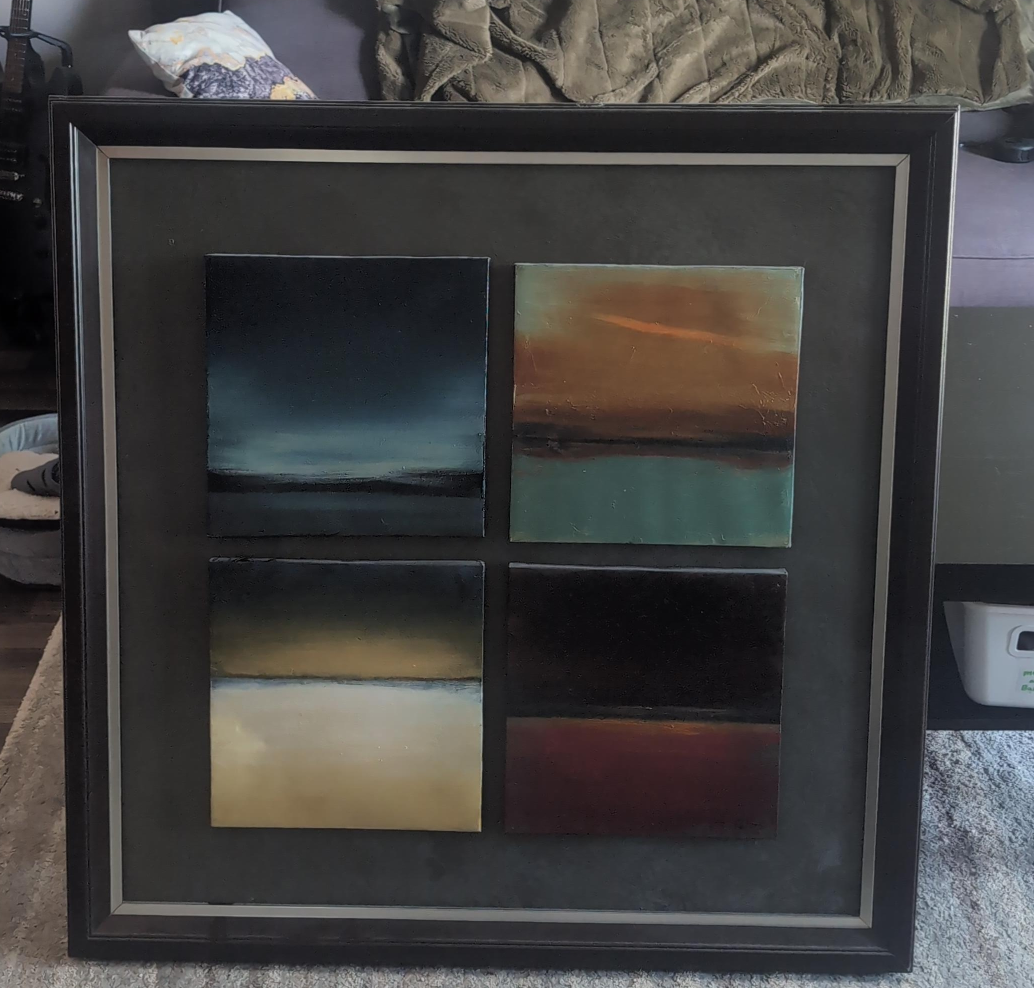 Looking to add a touch of modern art to your home? This framed wall art features an abstract design with four individual panels in a variety of muted tones. It's sure to be a conversation starter and a unique addition to any room