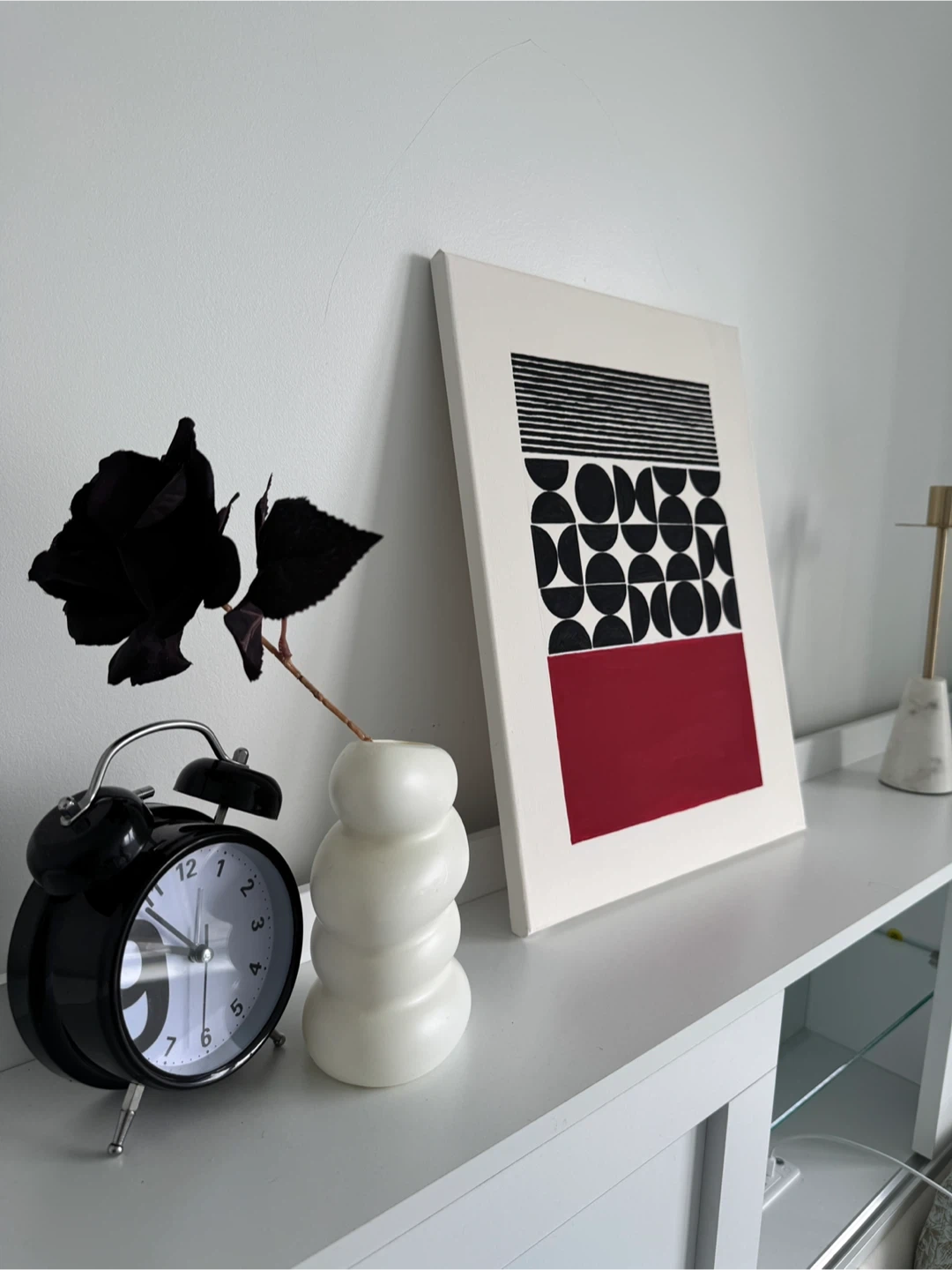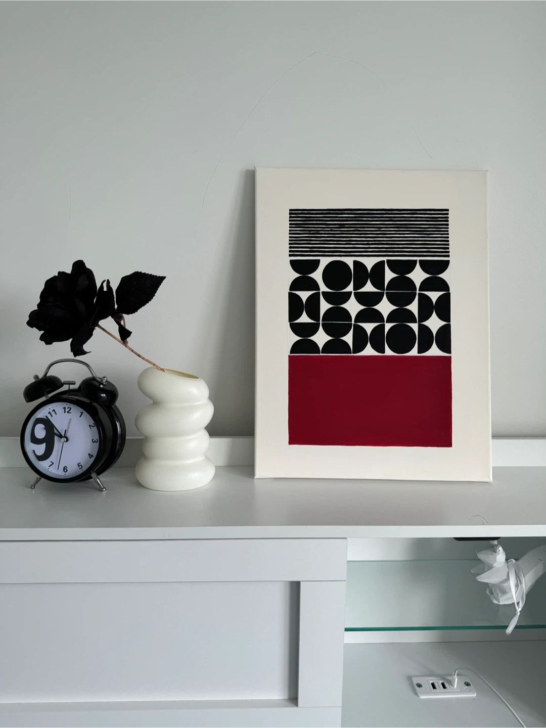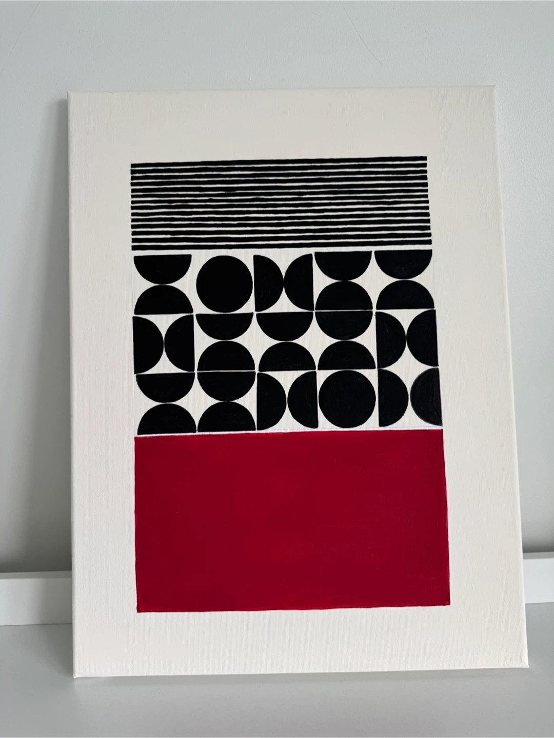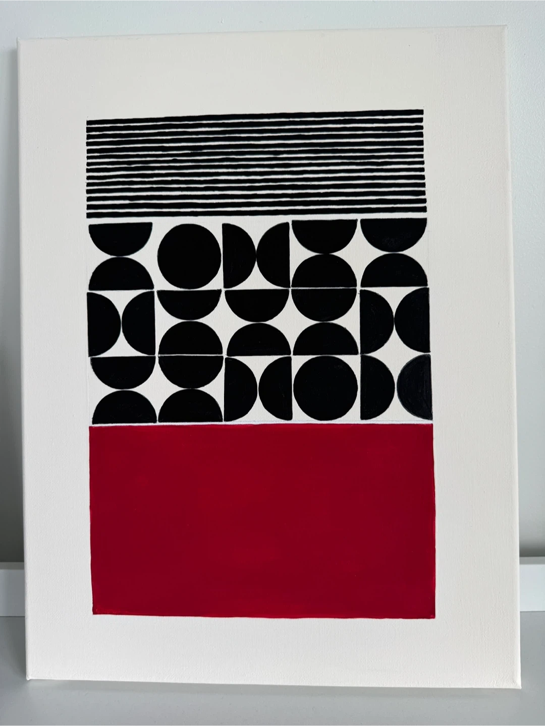 Here's a unique brand new, abstract geometric painting on canvas. It features a striking design with black lines, semi-circles, and a bold red rectangle. This piece would add a modern touch to any room! 30.5 cm * 40.5 cm / 12” * 16” Comes from a clean home pets free & smoke free.