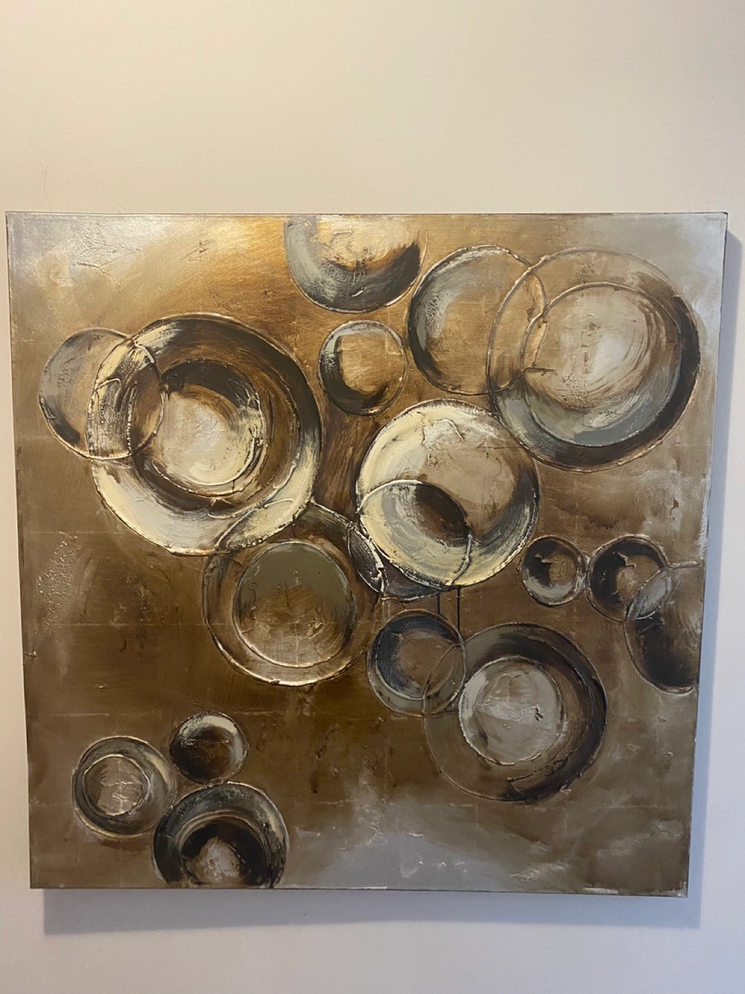 Large square canvas painting. Features overlapping circles in shades of brown, gold, and grey. Textured appearance. Modern abstract design.