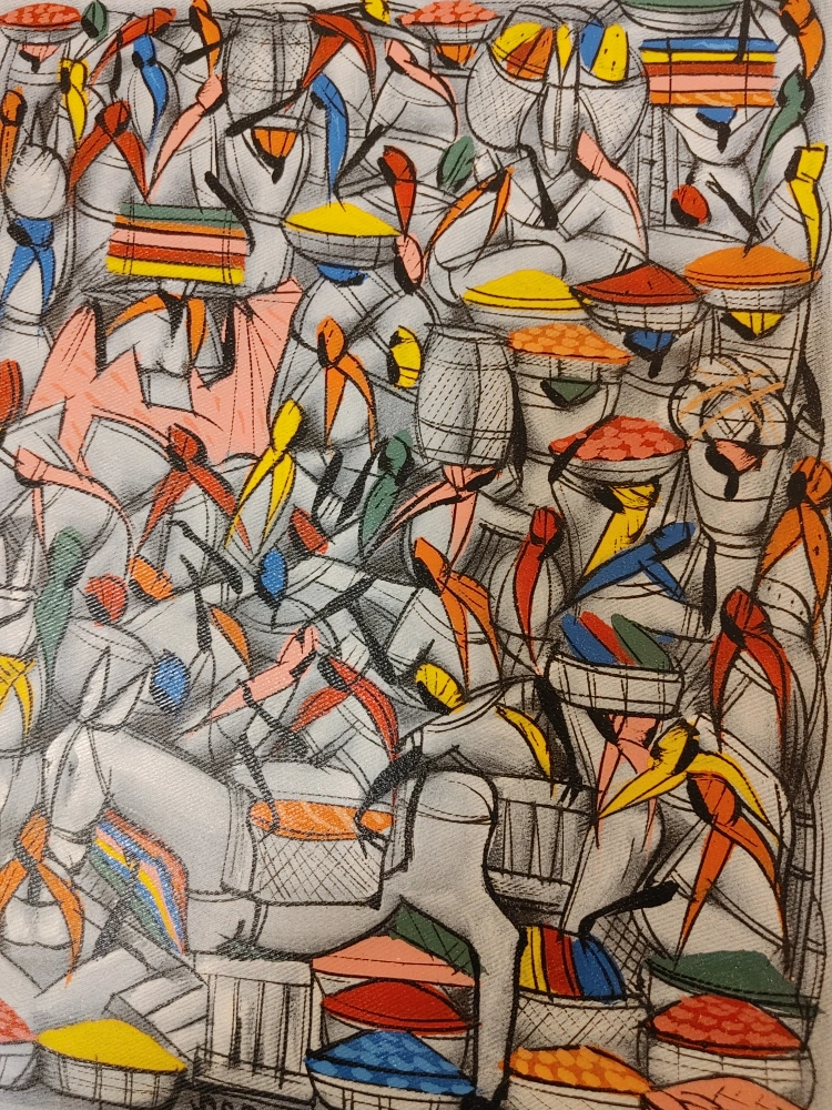 Here's a vibrant abstract painting depicting a bustling market scene. The painting features many figures and colourful baskets. It's sure to add a unique touch to any room!