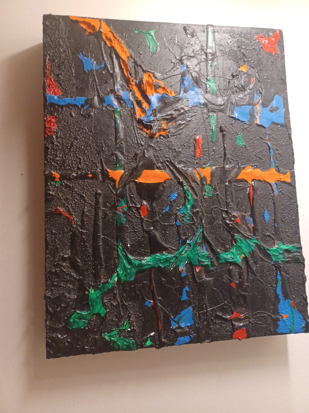 Unique abstract painting with a textured black background and vibrant pops of colour! This piece is sure to add character to any room