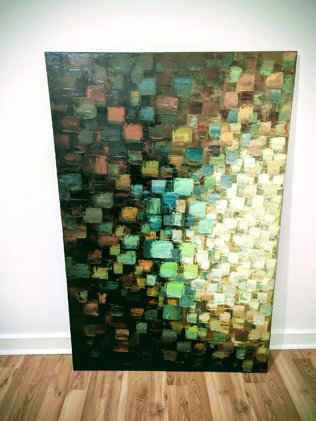 This is a beautiful abstract painting that would look great on any wall. The colours are very vibrant and eye-catching. It's in great condition and ready to be hung up in your home!