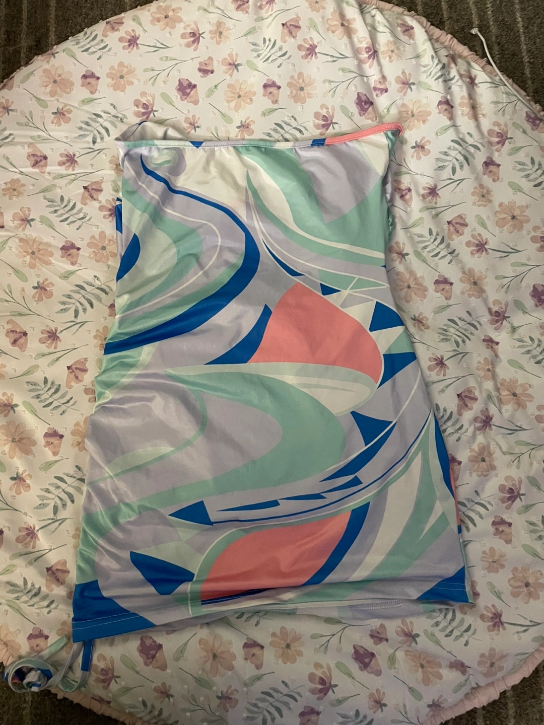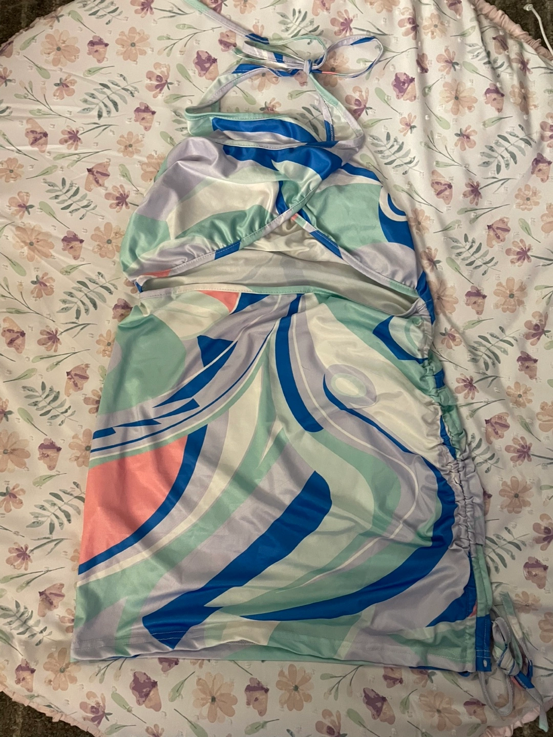 Stunning mini dress. Features a halter neckline and side cinching. Abstract print in blue, green, and pink. Great for a night out. Like new condition! No damages, stains or discolouration!