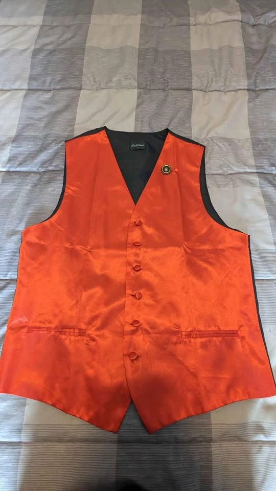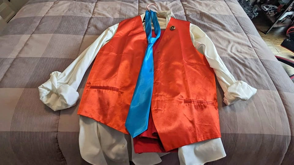 The full Apollo Justice Cosplay set comes with a medium sized red vest, blue tie, dress shirt (14.5in or 32, medium), red pants ( Abercrombie & Finch, W30 / L32). Attorney badge and homemade custom crafted bracelet are included.