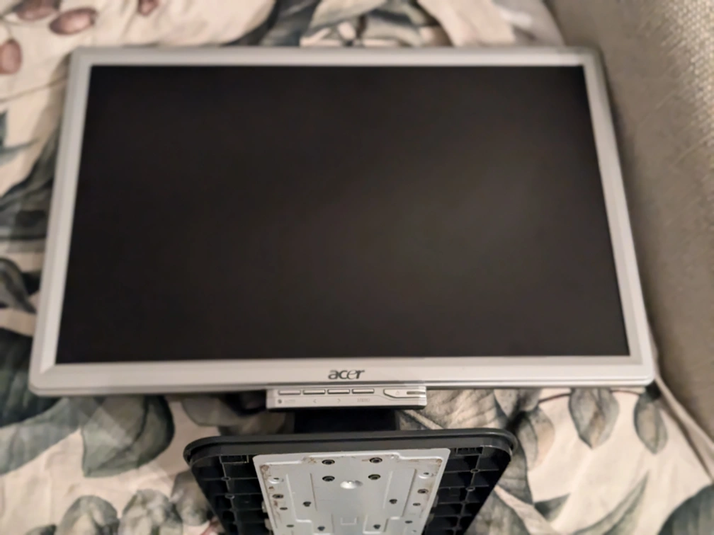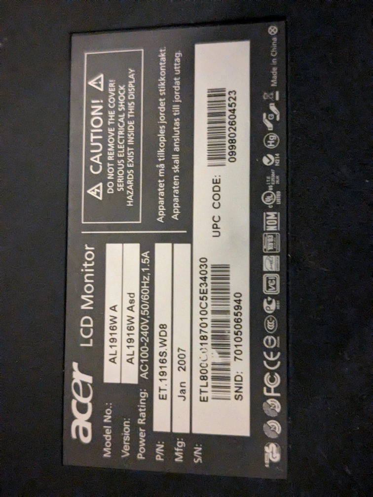 Silver Acer LCD monitor with integrated speakers and stand. It features a VESA mounting pattern and the screen is in good condition. The display is 19 inches and has an aspect ratio of 16:9.
