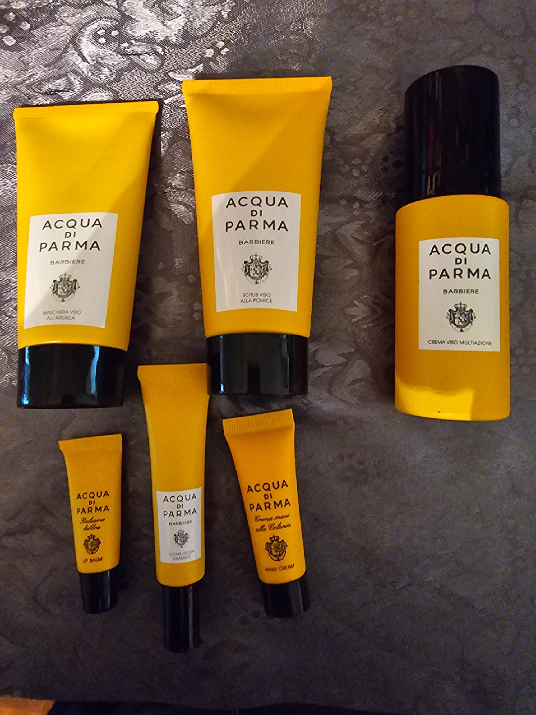 Selling a set of Acqua di Parma Barbiere products! Includes: - Maschera Viso All'Argilla - Scrub Viso Alla Pomice - Crema Viso Multiazione - Up Balm (Badane labbra) - Crema Occhi - Hand Cream (Crema mani alla Colonia)
