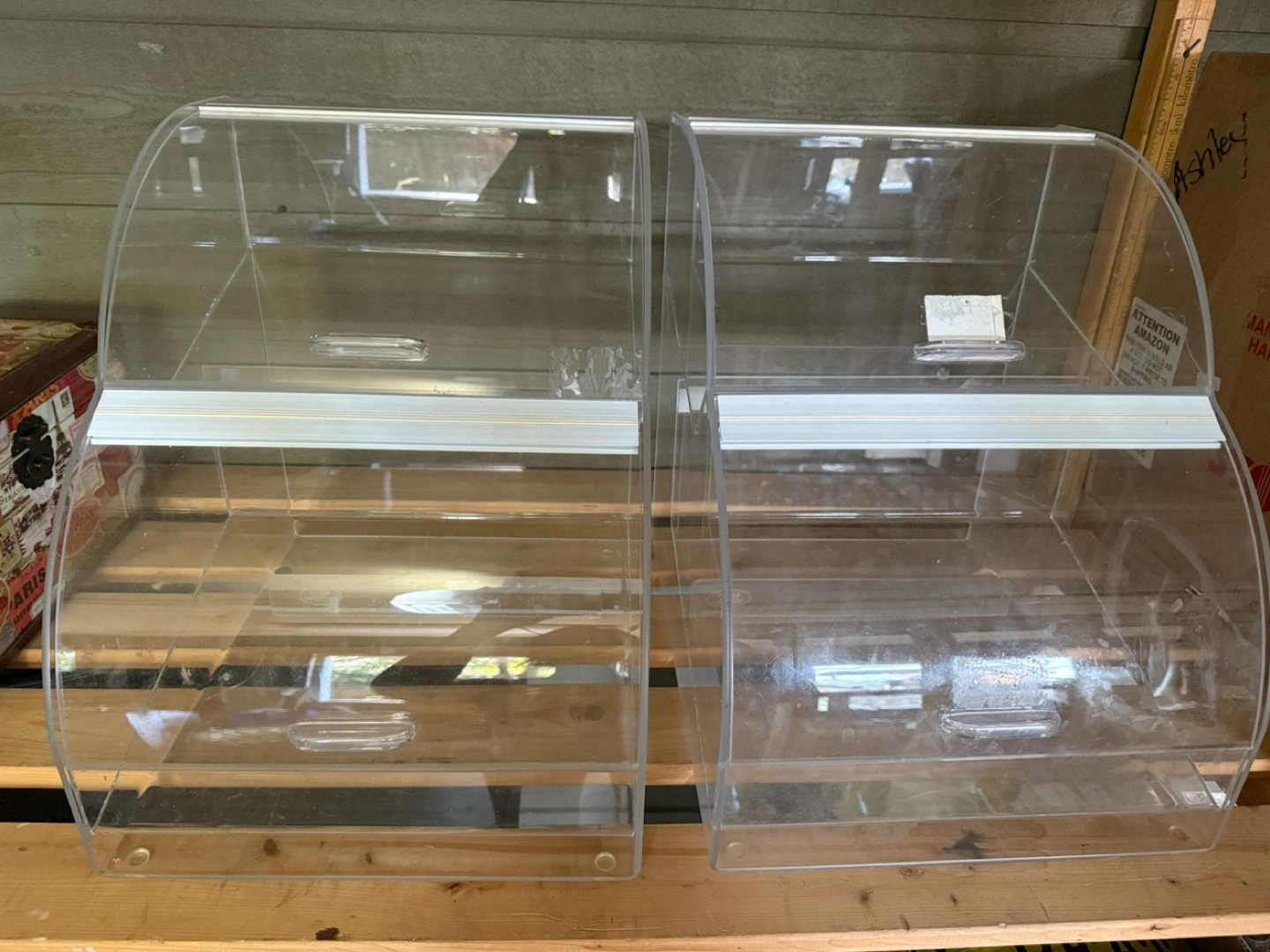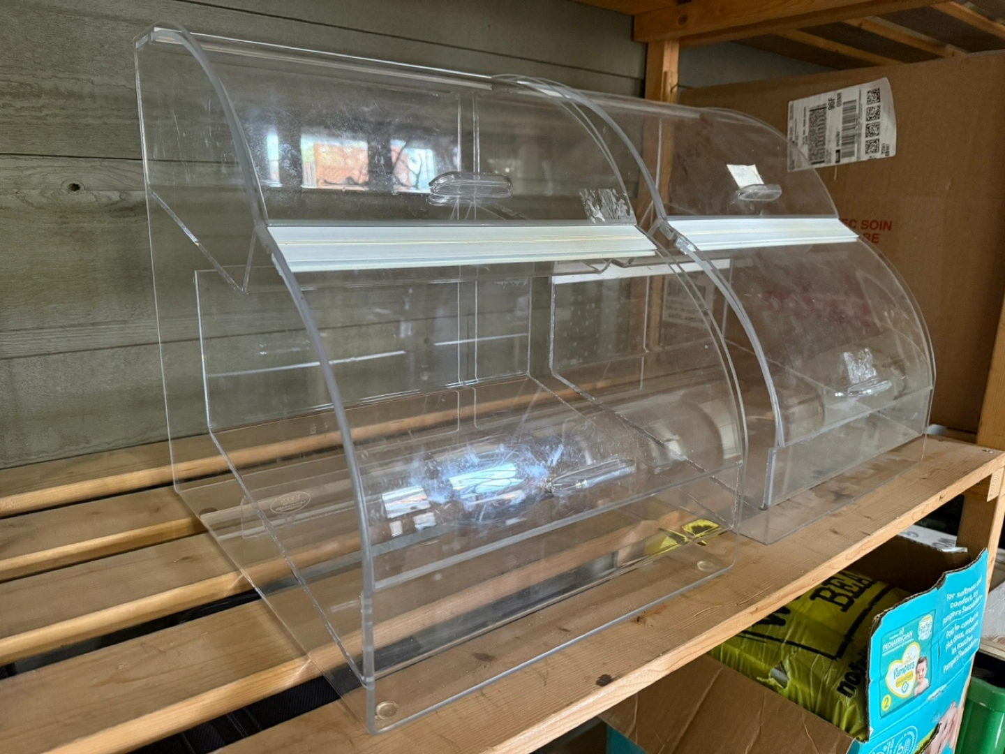 set of two clear acrylic display cases. they are designed with a rounded top and 2 hinged front doors. cases are perfect for organizing and showcasing your items, letting you create an organized space. both will need a good wash as they have been stored in the garage. asking 10$ each.