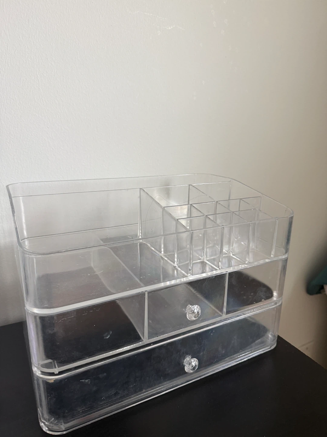 Selling a clear acrylic makeup organizer. It has multiple compartments on top and two drawers below, perfect for organizing your cosmetics and keeping your space tidy