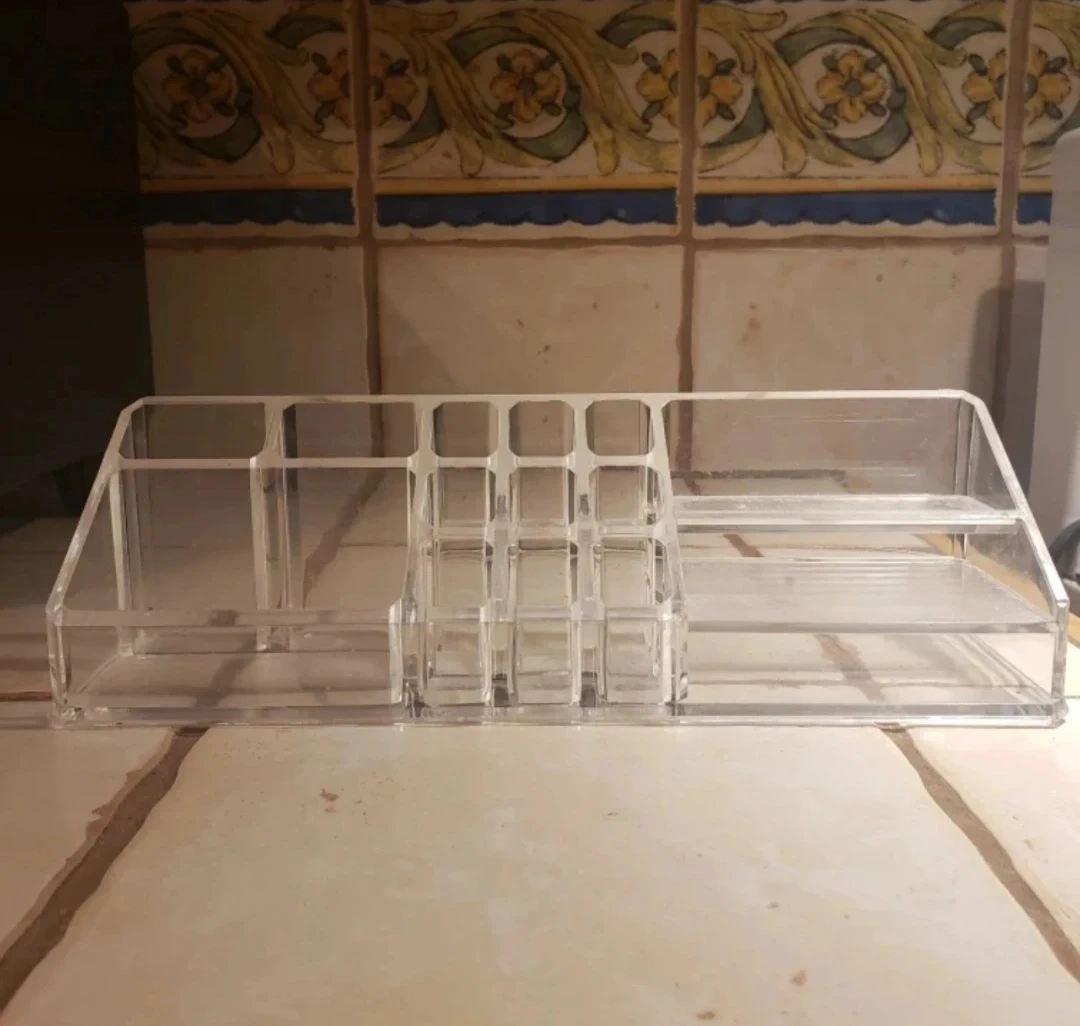 Clear acrylic makeup organizer with multiple compartments. Great for storing lipstick, eyeshadow palettes, and pencils.