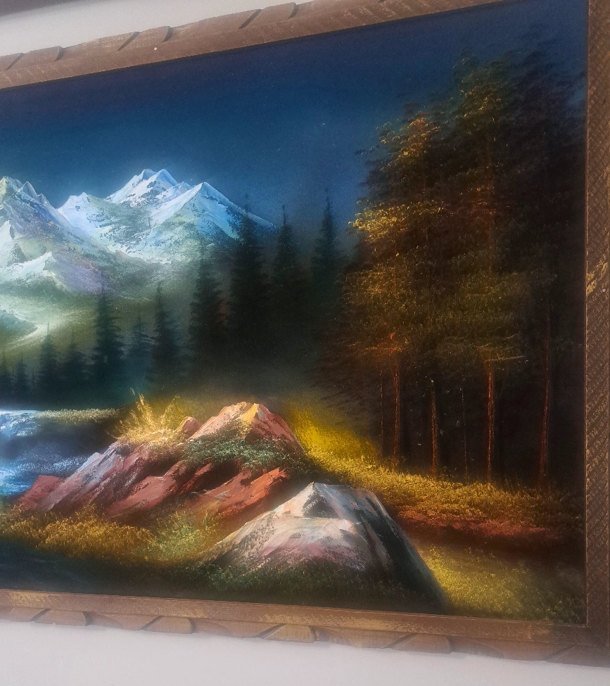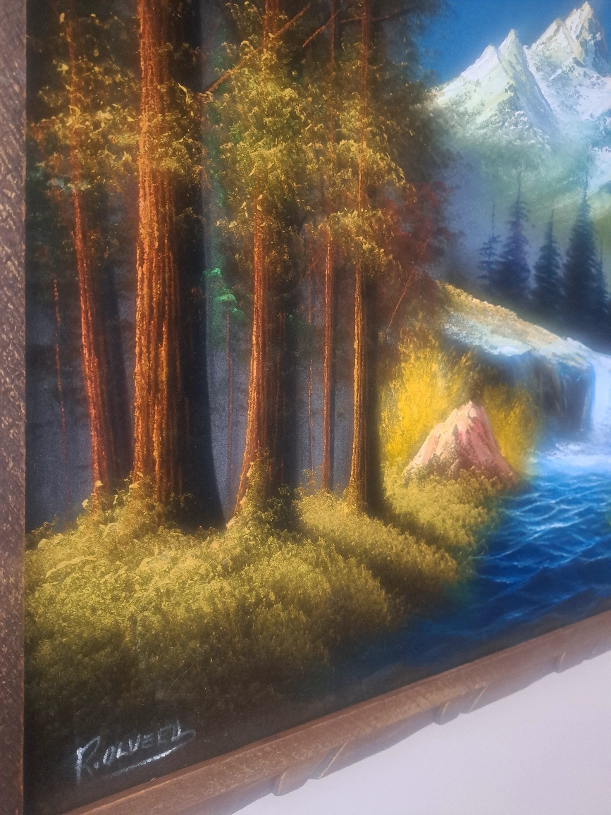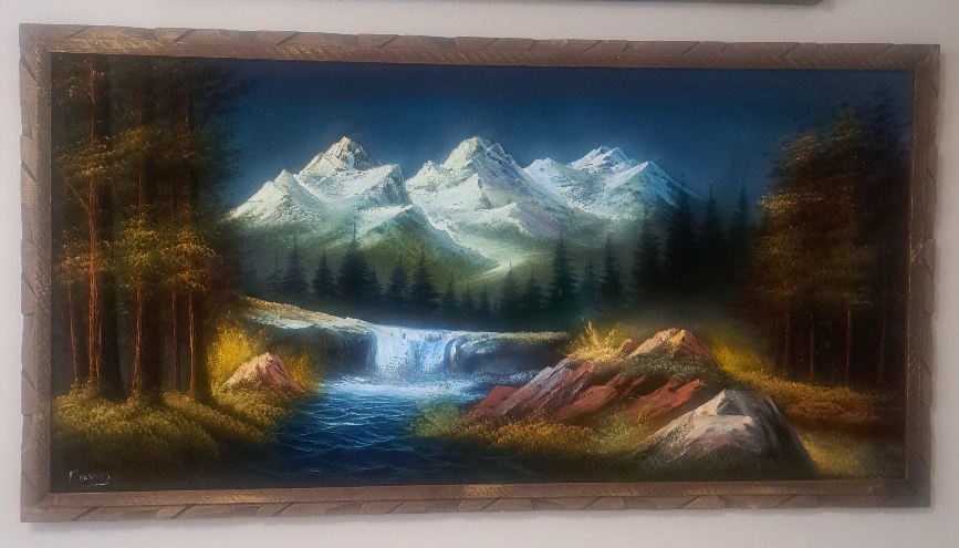 Amazing Acrylic / Oil Painting art work. Fine detail by the artist with every stroke. Looks great in every wall. Beautiful work of art leaving you in awe! The image displays a framed landscape painting featuring a vibrant natural scene. Subject Matter: The painting depicts a mountainous landscape with snow-capped peaks in the background, a flowing waterfall and river in the mid-ground, and lush green forests and rocky terrain in the foreground. Art Style: The style appears to be a realistic or impressionistic representation of nature, possibly an oil or acrylic painting, given the texture and detail. Composition: The composition draws the eye from the foreground's river and waterfall towards the majestic mountains, creating depth and a sense of tranquility. Framing: The artwork is presented within a decorative, possibly wooden, frame that complements the natural theme of the painting. H 26.5 inch x W 50.5 inch