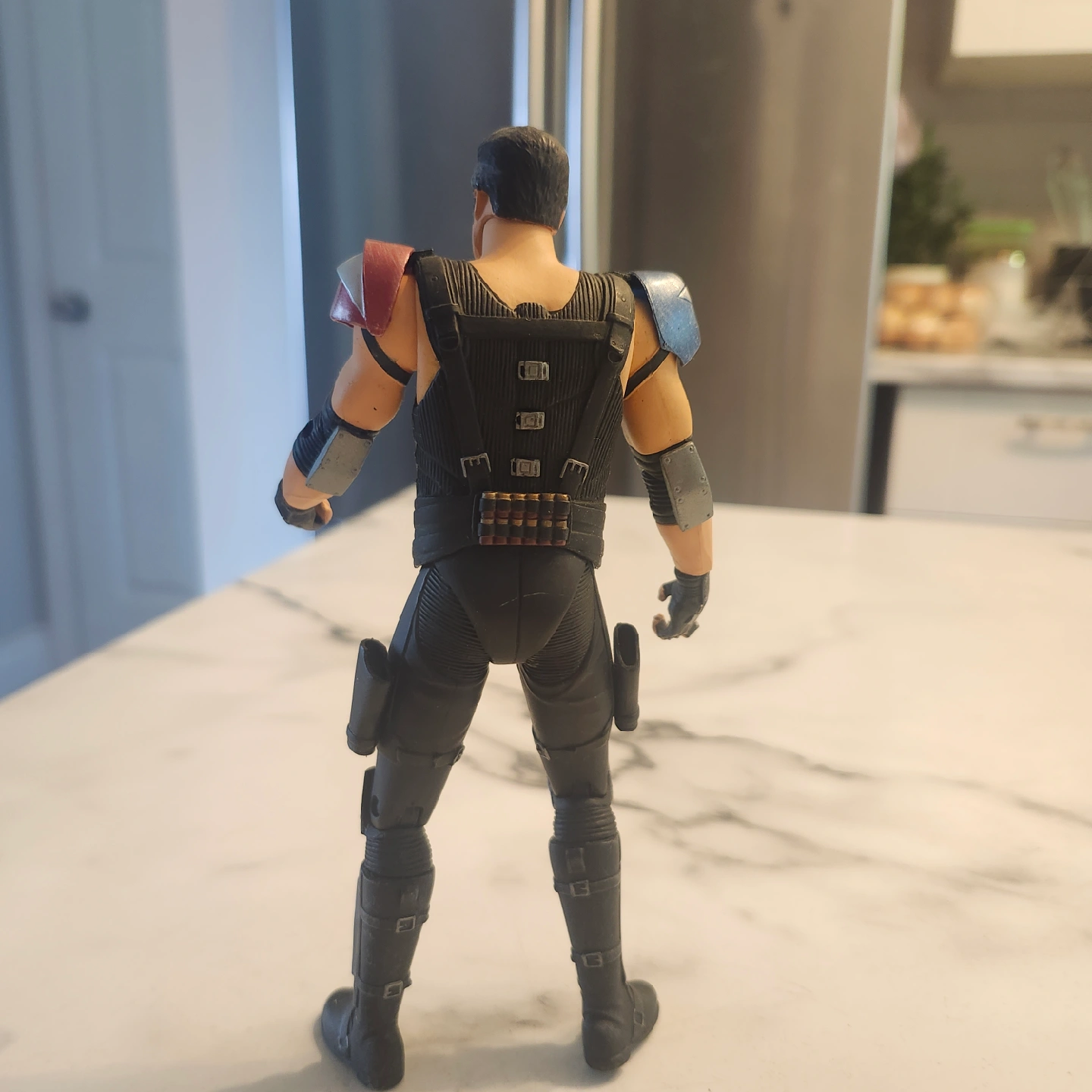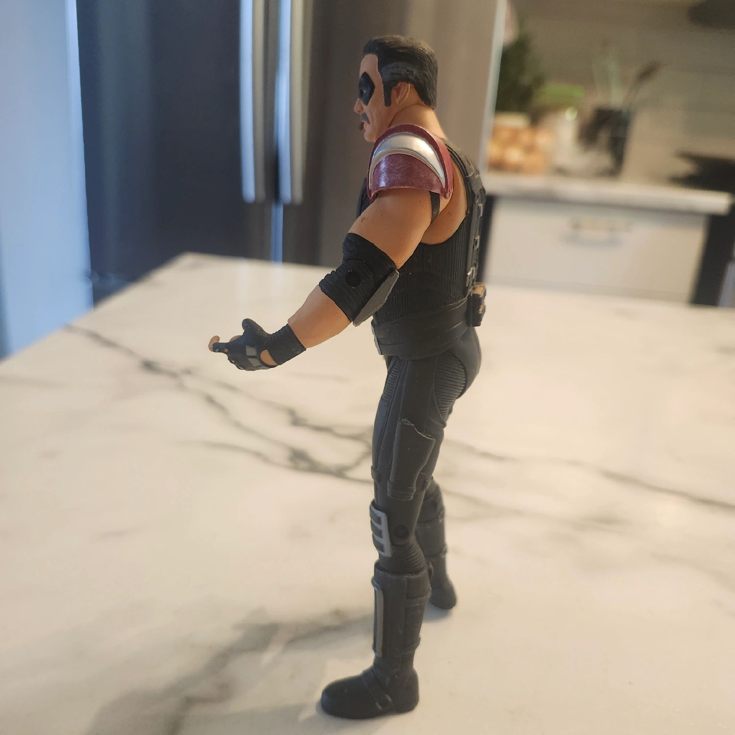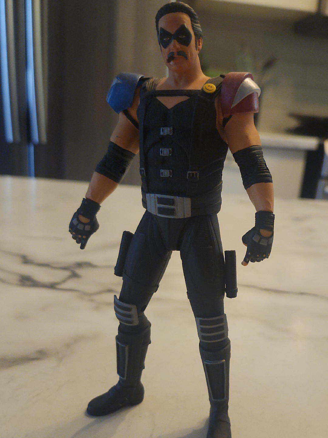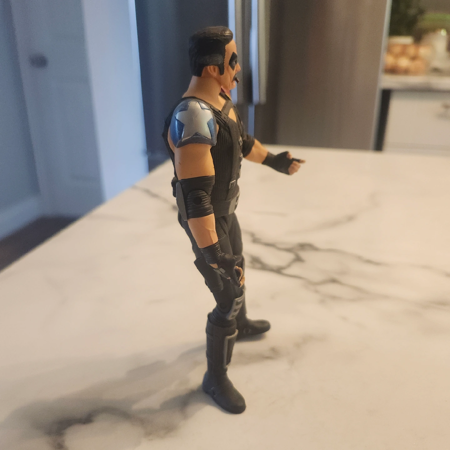 Selling an action figure of a humanoid character. The figure is wearing a black suit with blue and red shoulder pads. It has a smiley face on one of the shoulder pads.