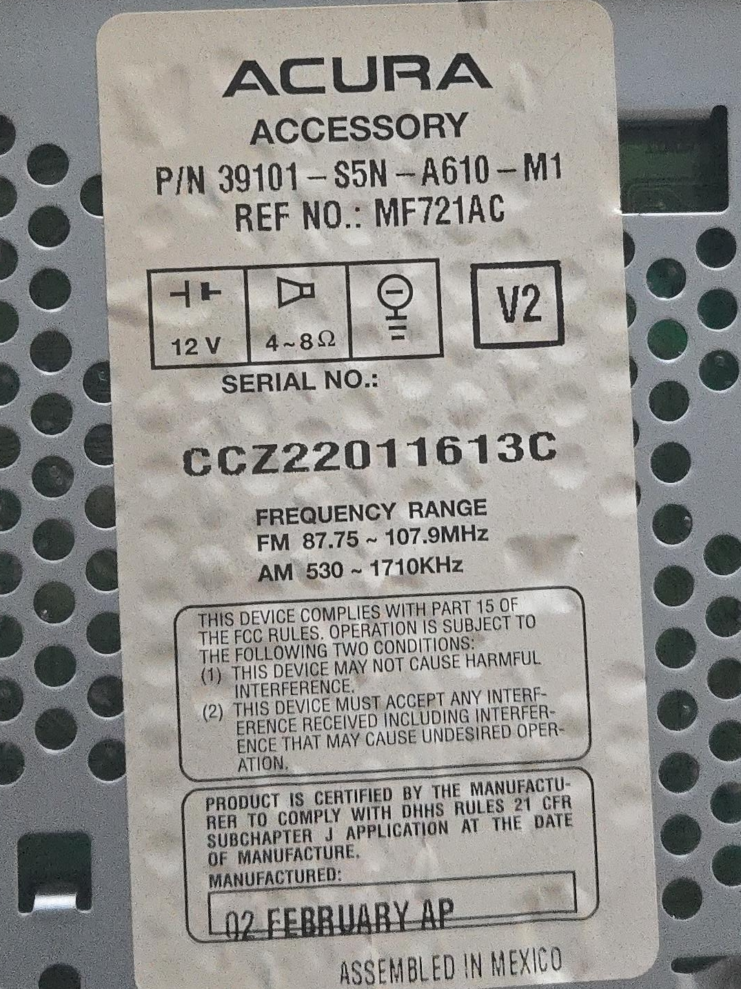 Selling an Acura car stereo/radio CD player. It's in good condition and ready to be installed in your vehicle. It supports FM 87.75 ~ 107.9MHz and AM 530 ~ 1710KHz frequency ranges.