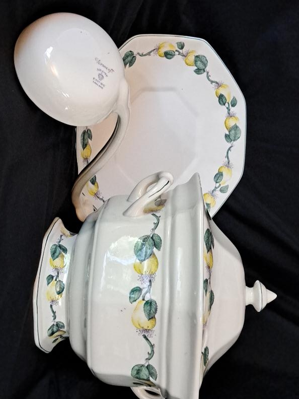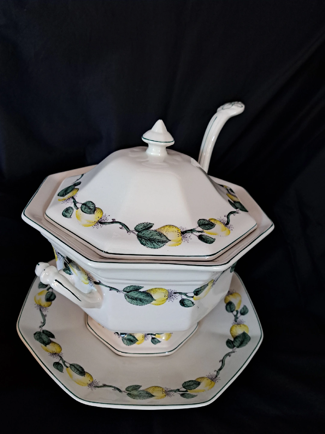Selling a beautiful Adams Vermont Real English Ironstone soup tureen with a lovely lemon pattern! It comes with a matching lid, ladle, and underplate. It's in great condition and would make a wonderful addition to any table setting