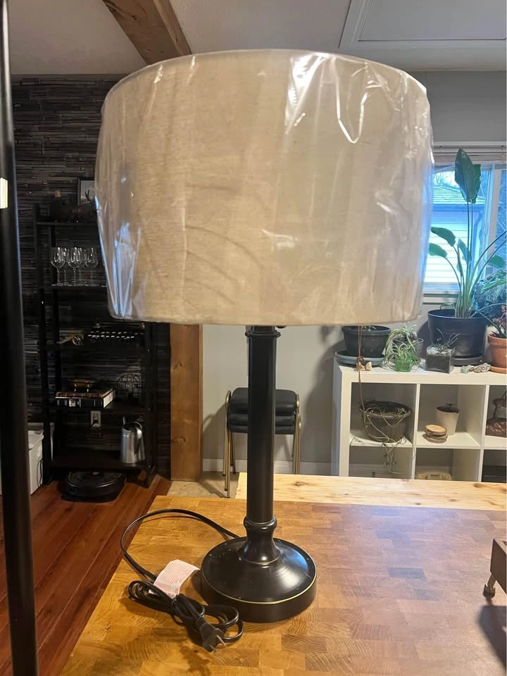Like new table lamp still with wrapped shade. Pick up in highland park