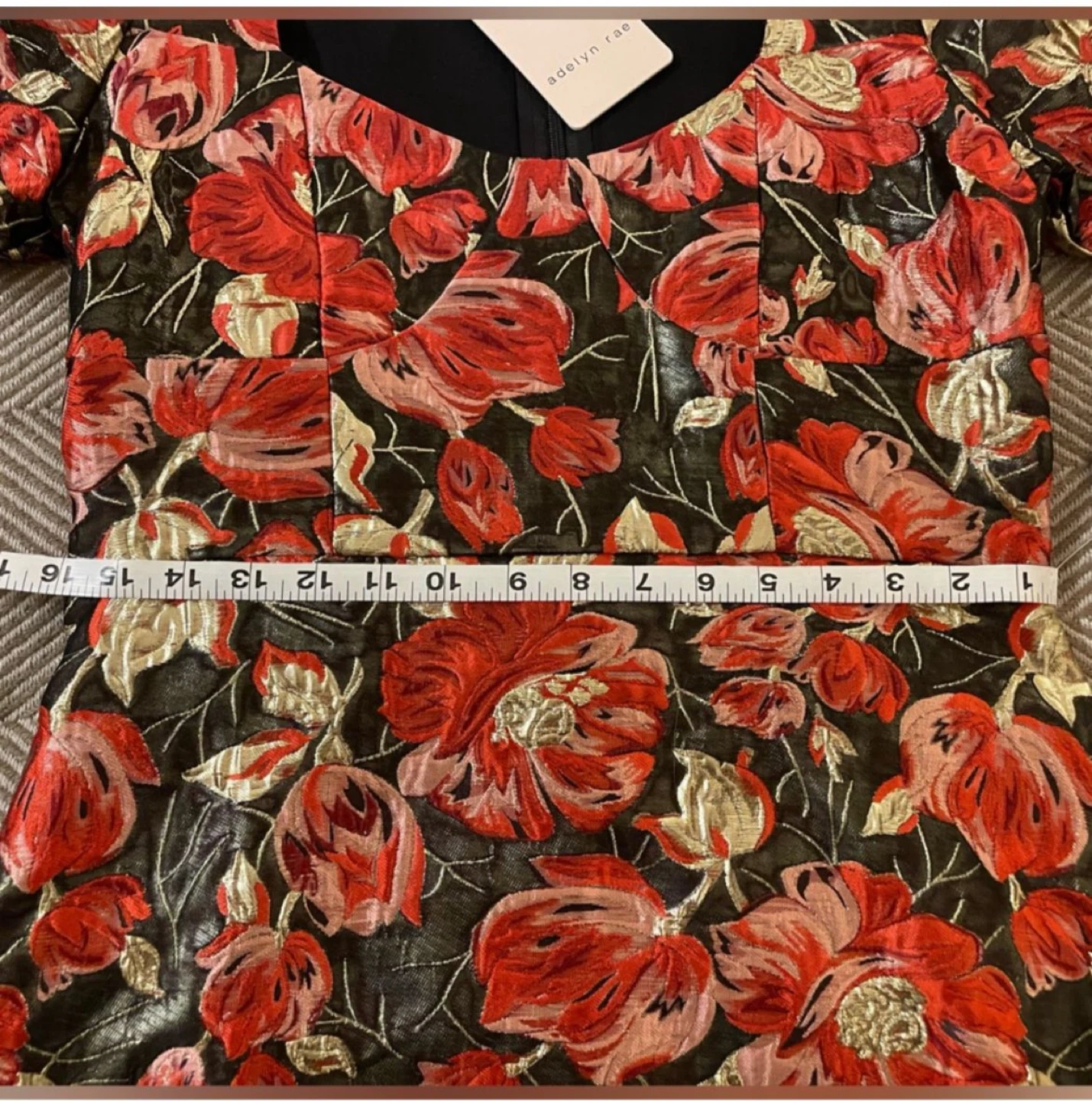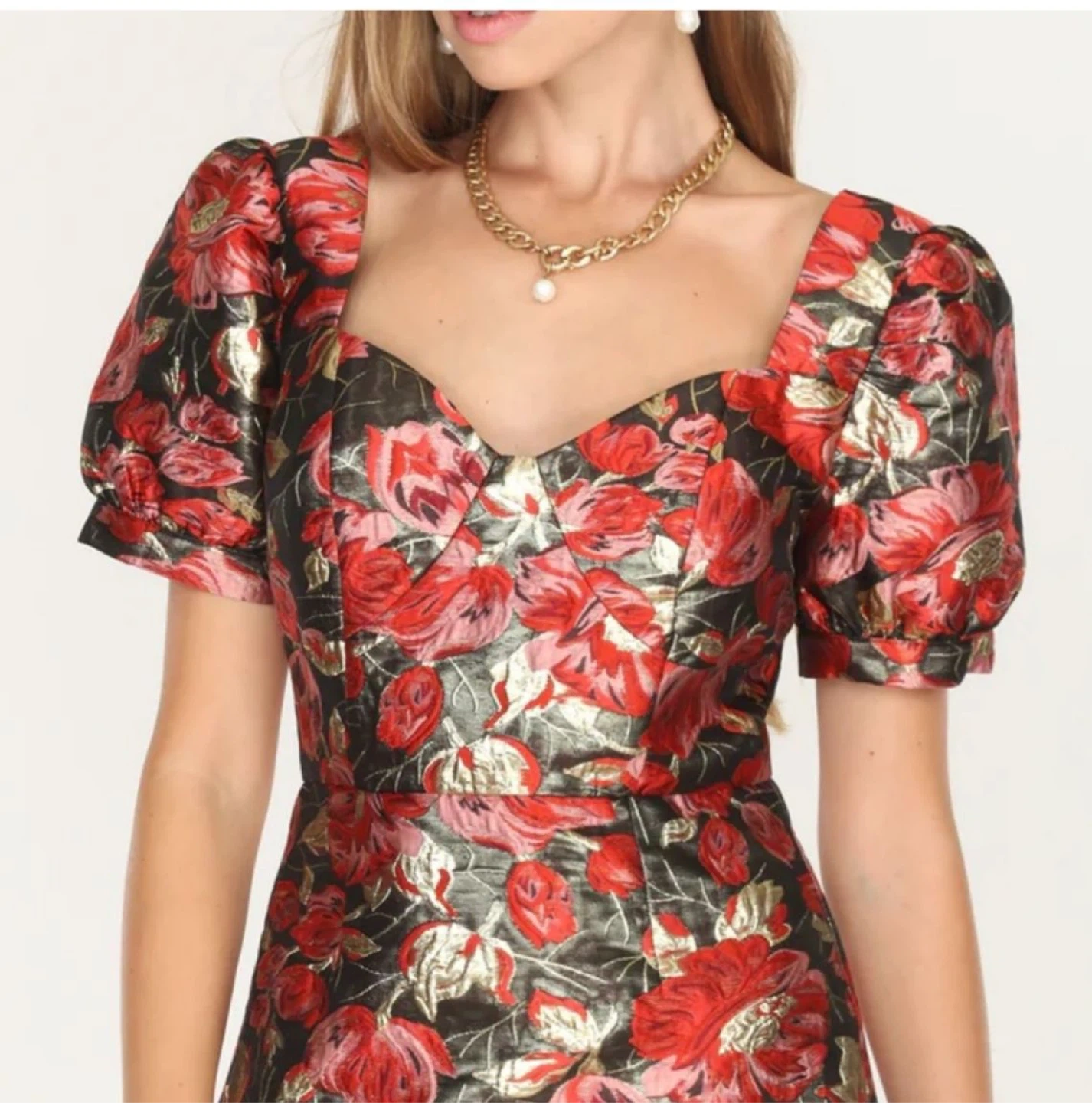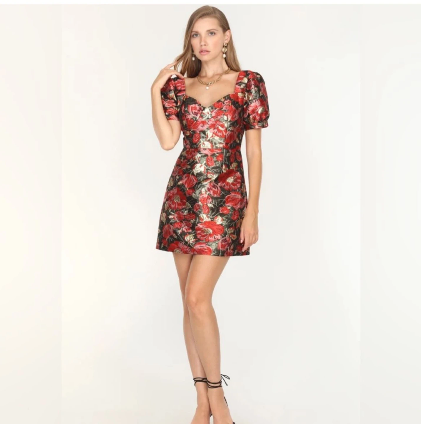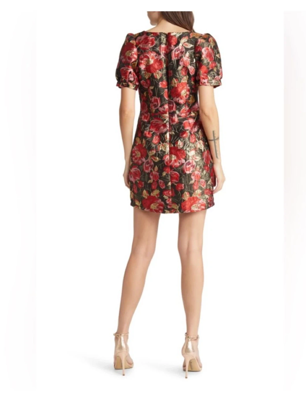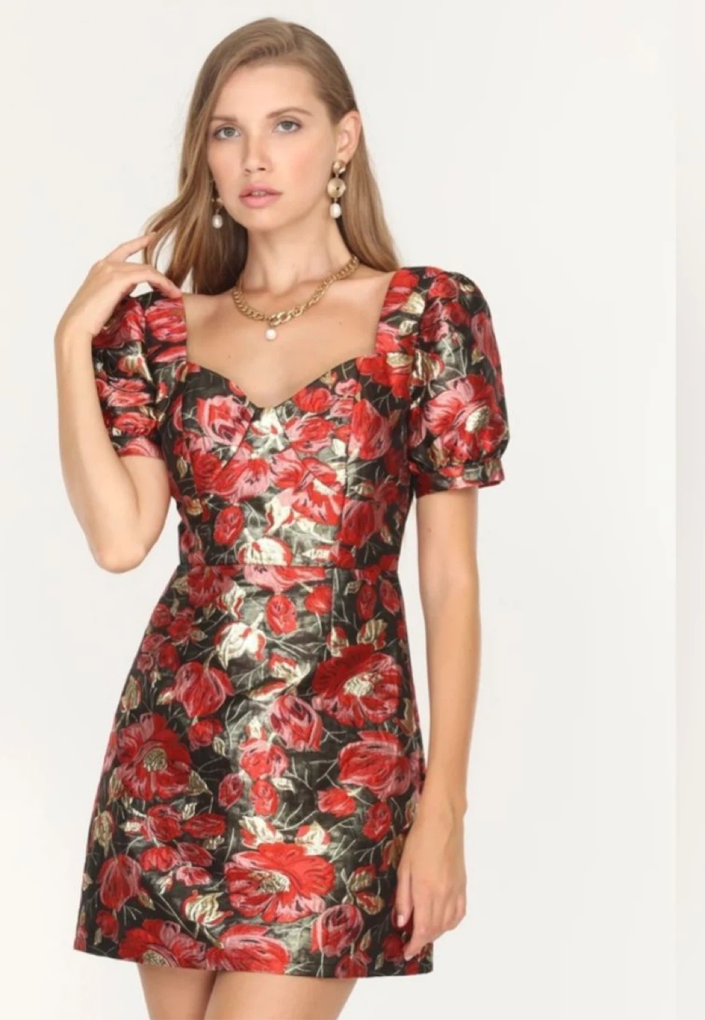 Selling a cute Adelyn Rae mini dress! It features a beautiful floral jacquard pattern with red, pink, and gold accents on a black background. The dress has short puff sleeves and a flattering silhouette. Size small