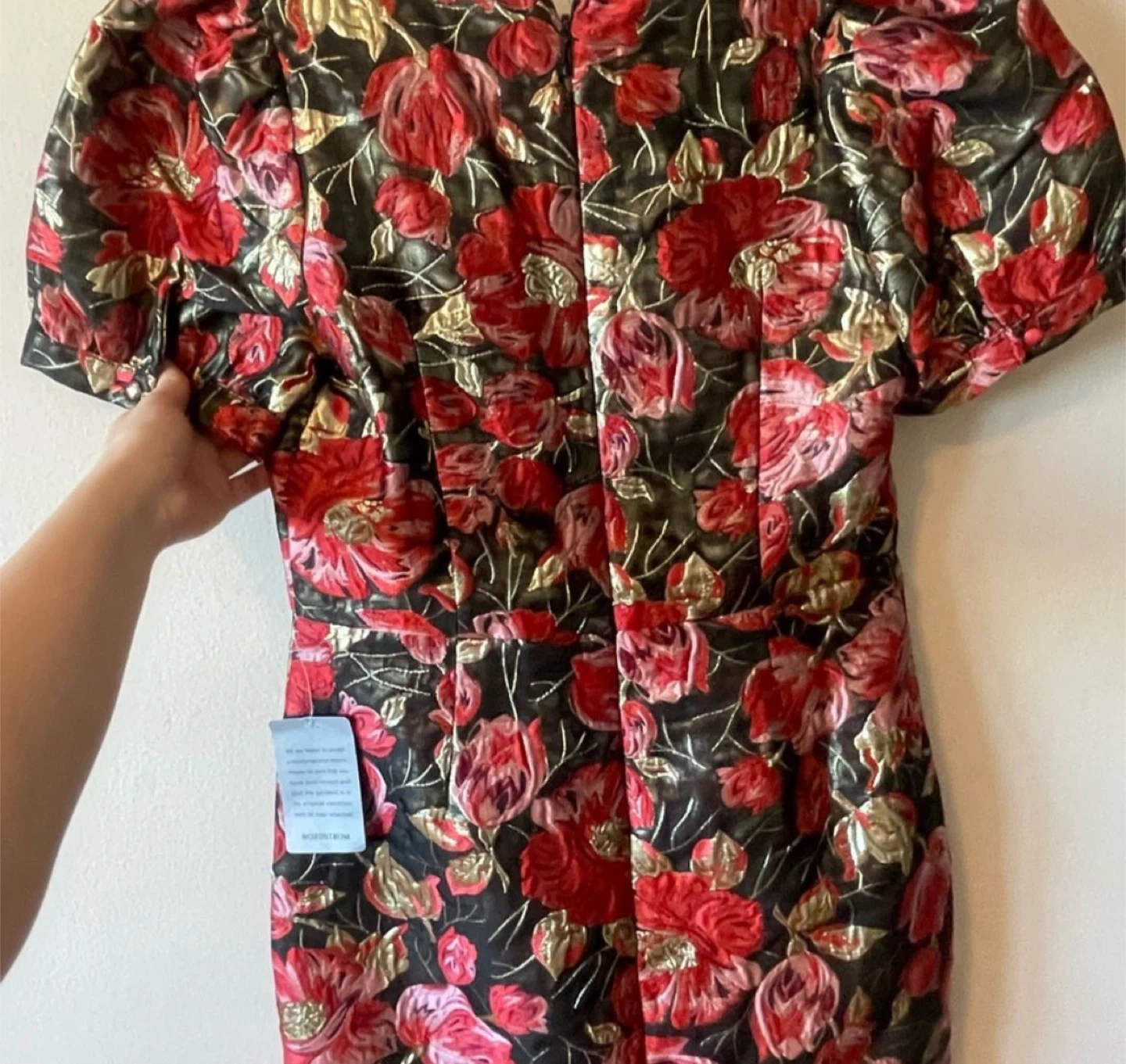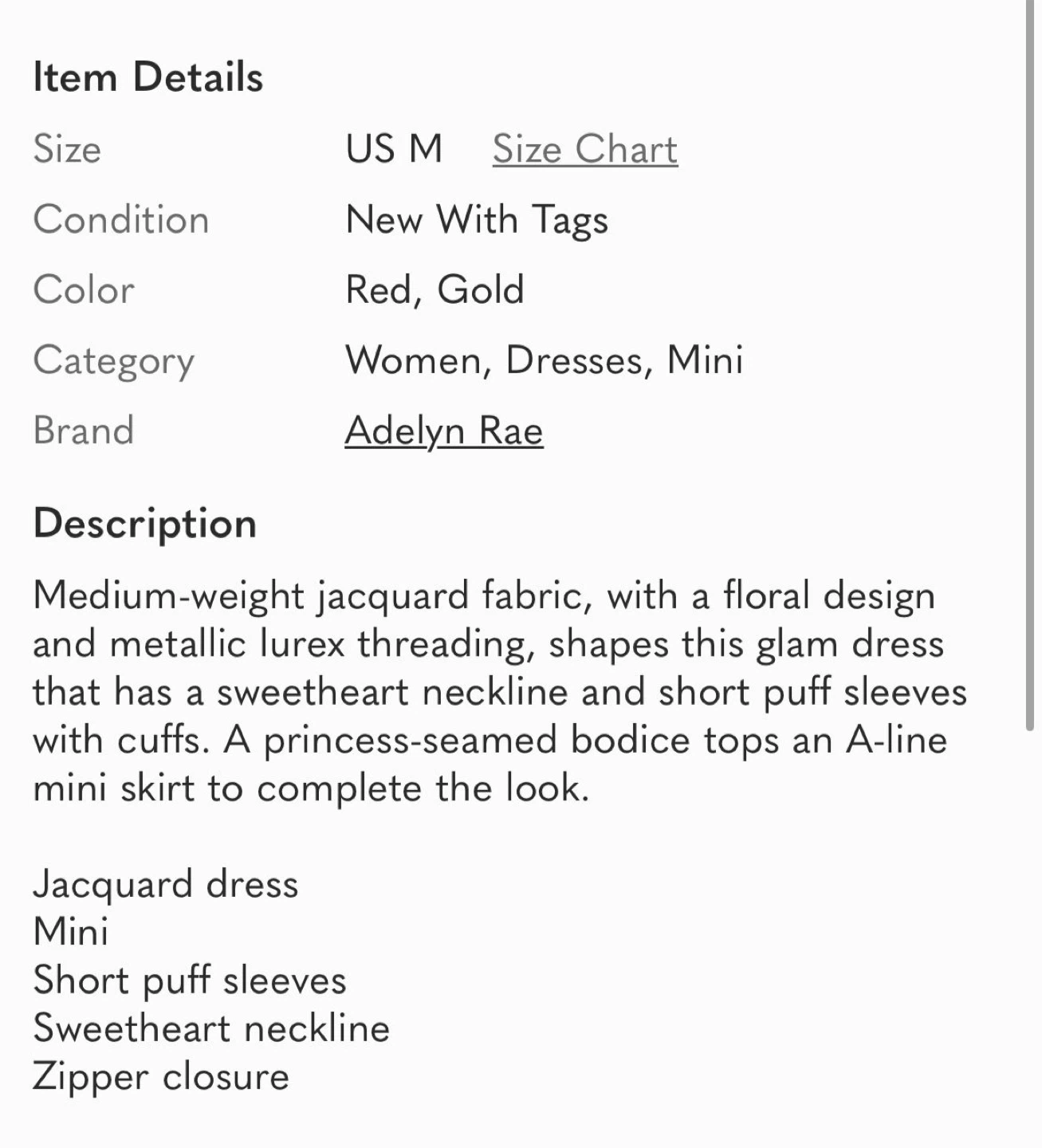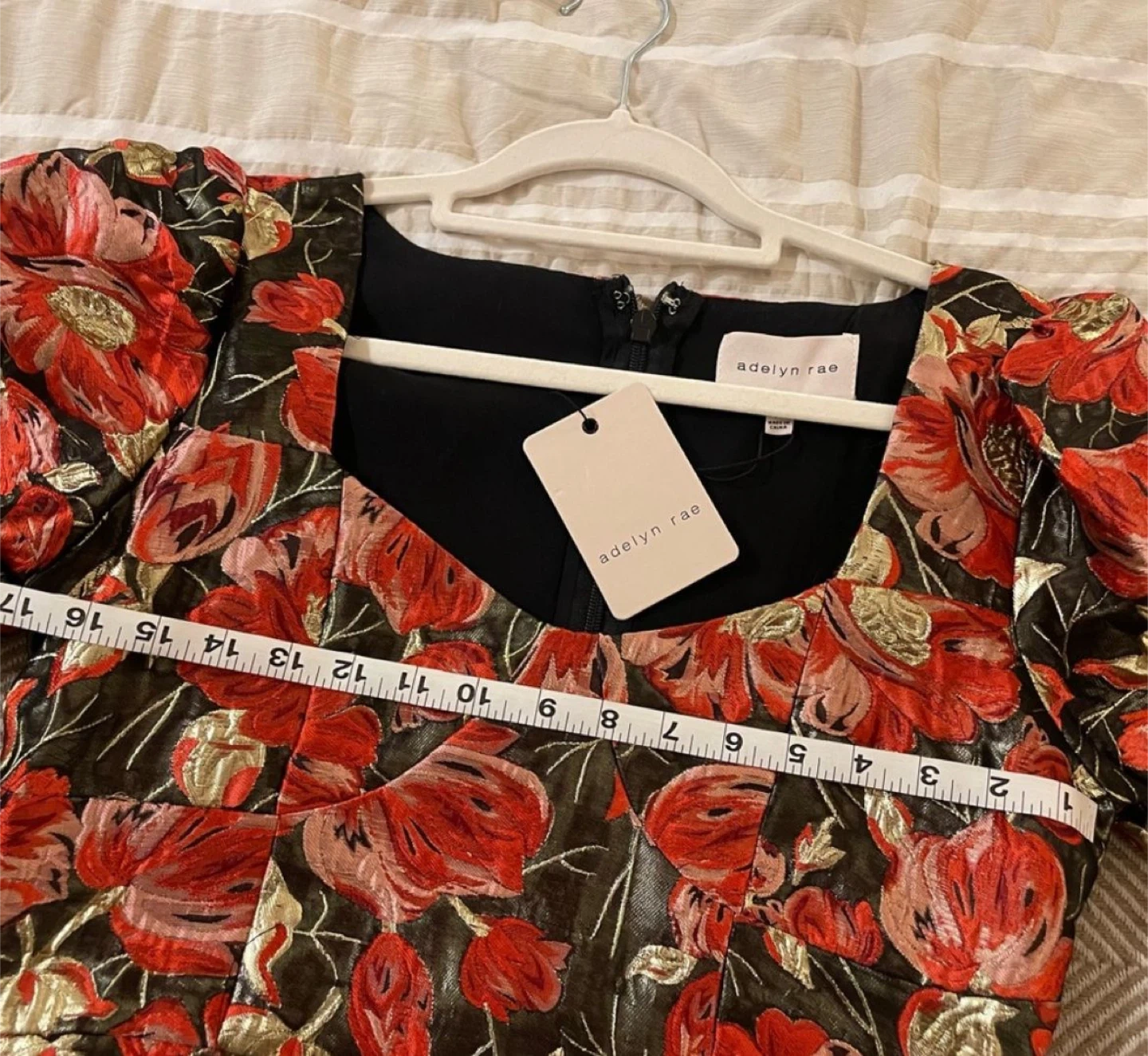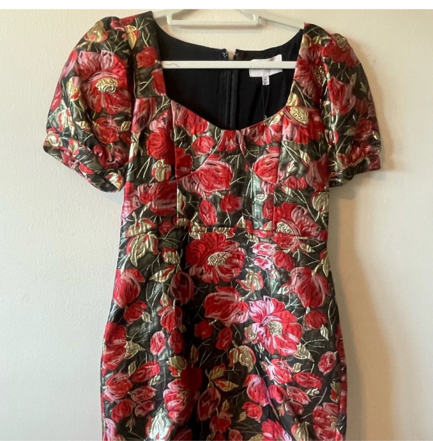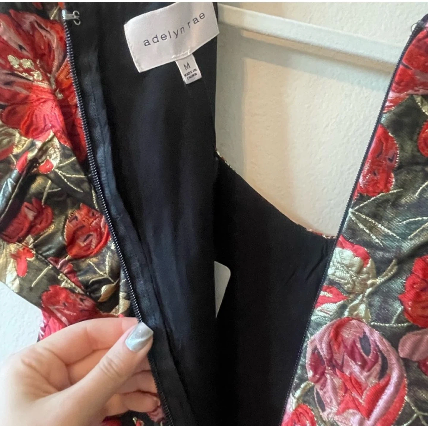 Selling a cute Adelyn Rae mini dress! It features a beautiful floral jacquard pattern with red, pink, and gold accents on a black background. The dress has short puff sleeves and a flattering silhouette. Size small