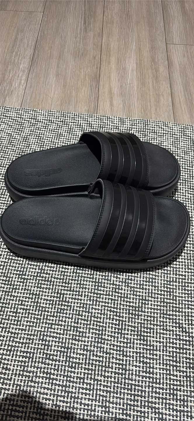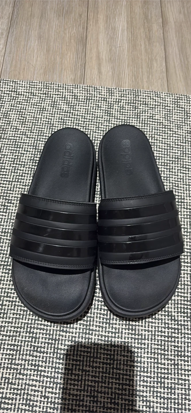 These Adidas Adilette Comfort slides are perfect for everyday wear! They're in great condition and feature the classic three-stripe design. The slides are black and super comfy, making them ideal for around the house or a quick trip out size 9