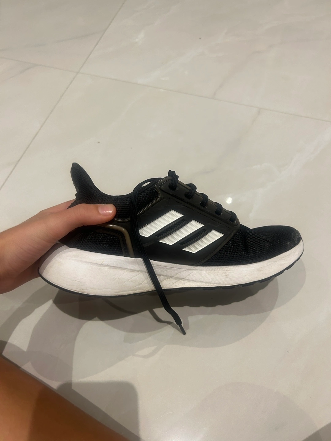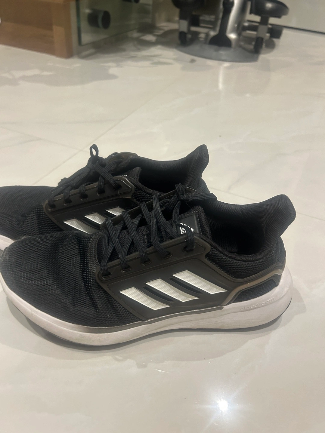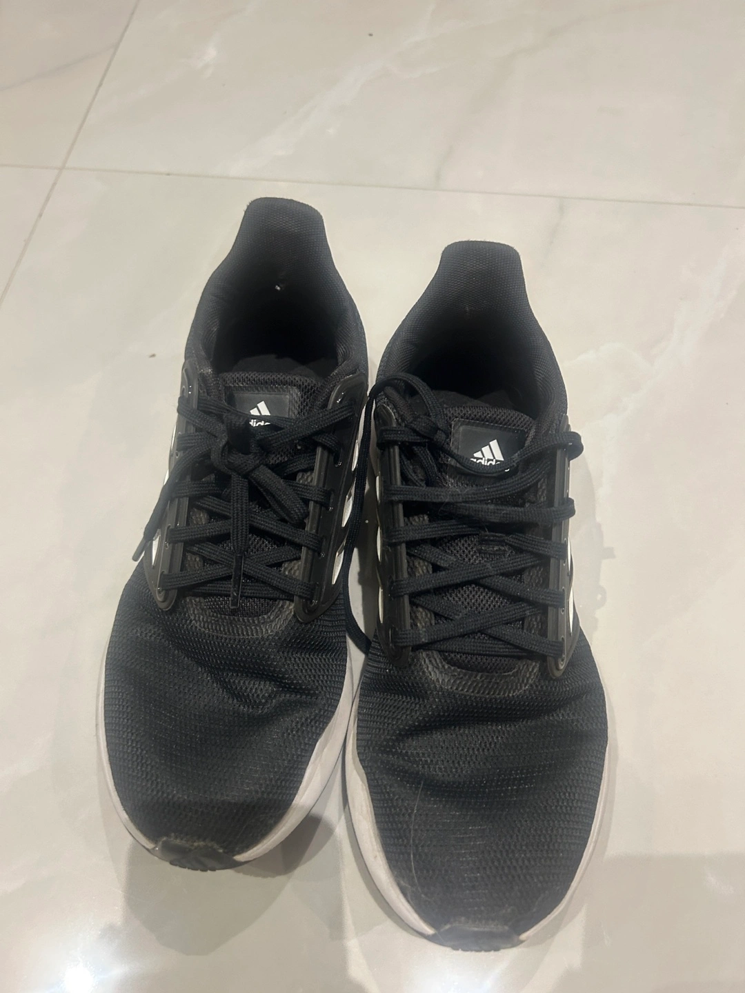 Selling a pair of Adidas running shoes in black. They have the classic three stripes on the side. Size 7.5-8 in womens.