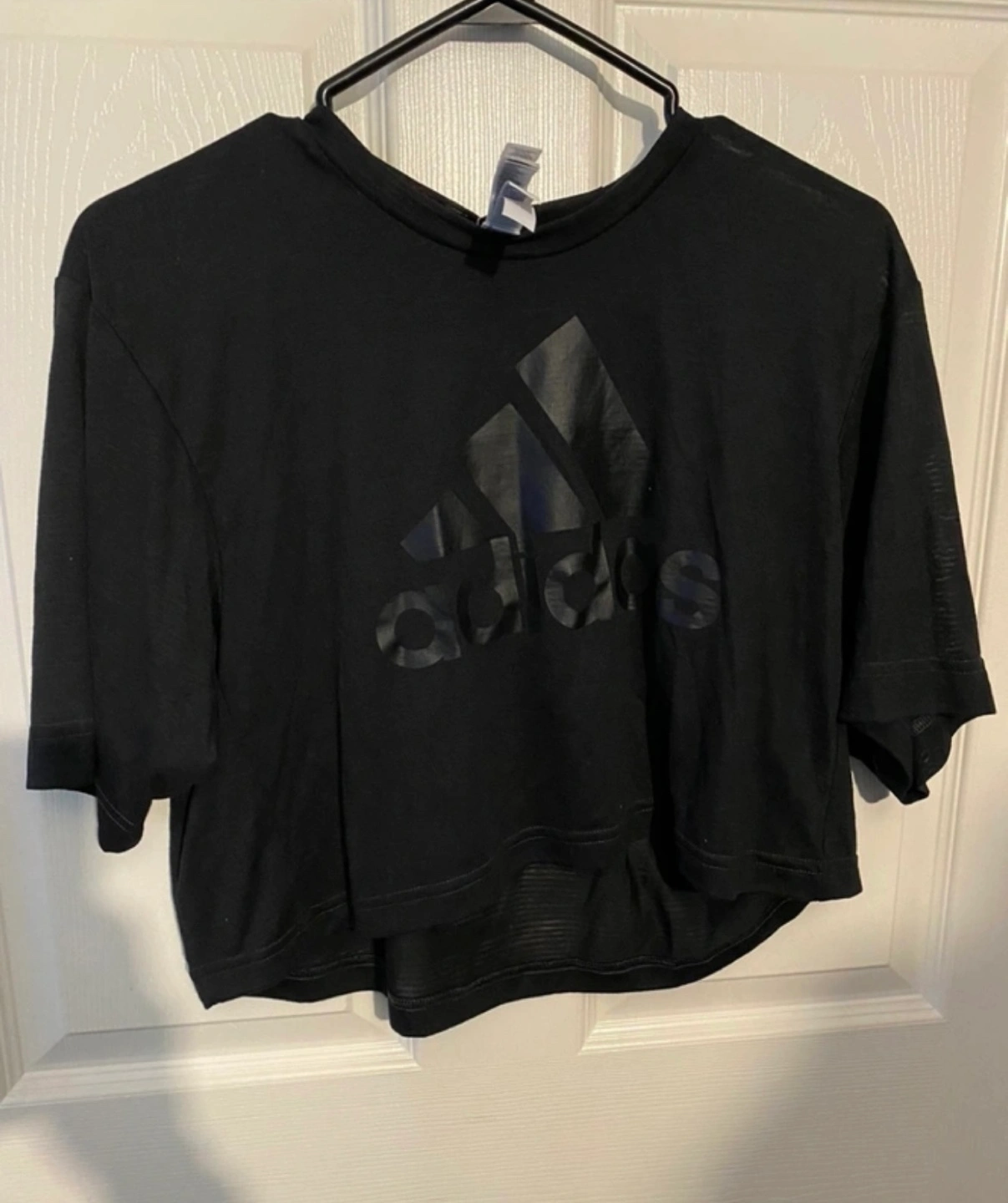 Black Adidas crop top. Short sleeves. Features a large Adidas logo. Size medium.