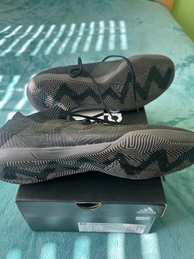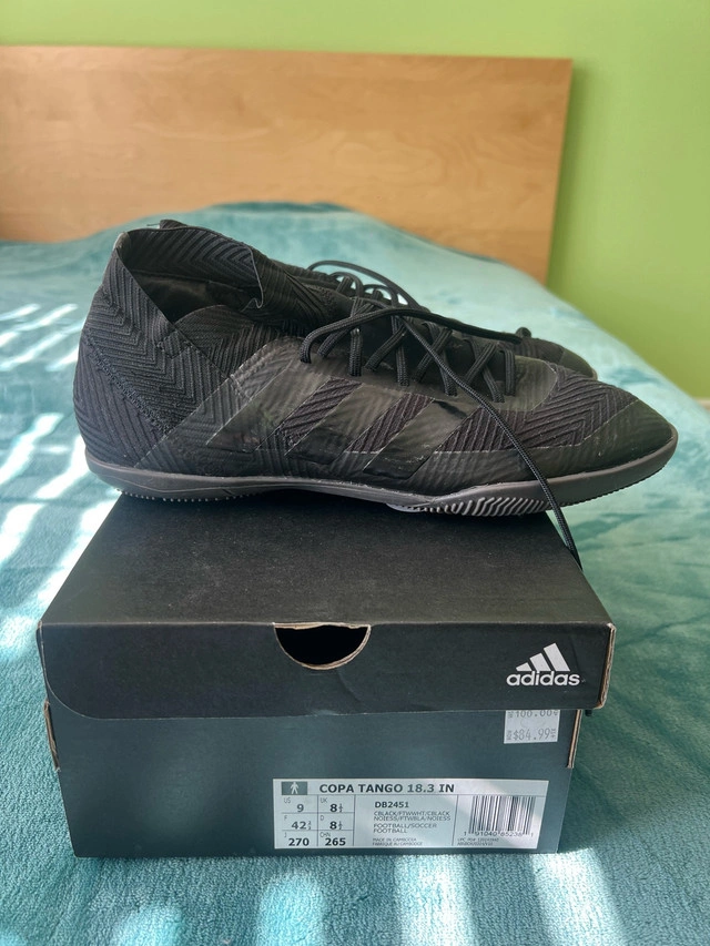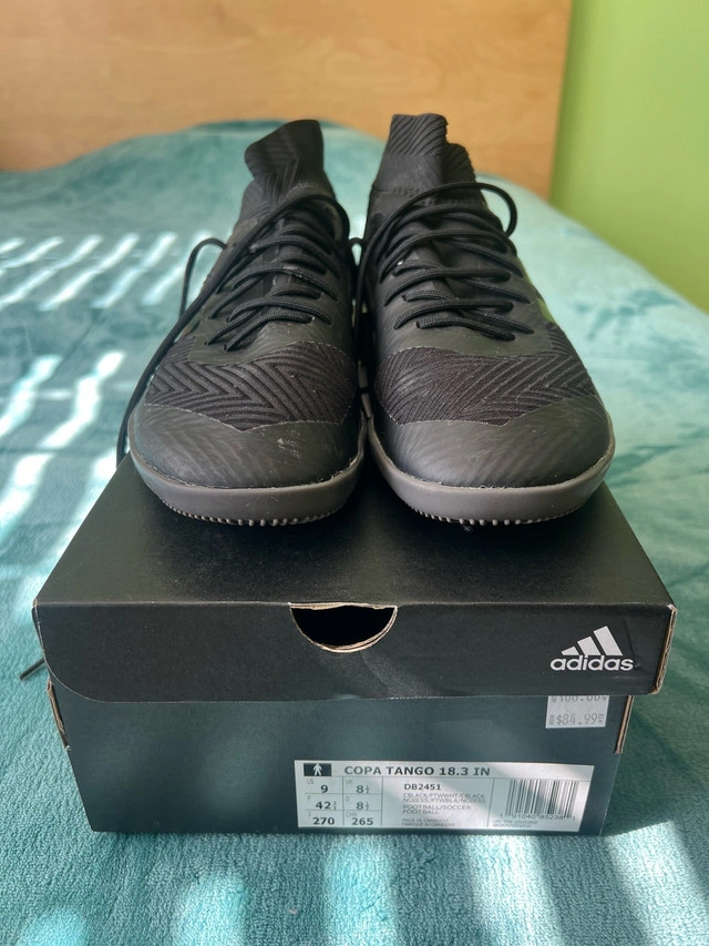 Get ready to dominate the indoor game with these Adidas Copa Tango 18.3 IN soccer shoes, size 9! These shoes are in great condition and ready to help you elevate your performance. Specifications: * Brand: Adidas * Model: Copa Tango 18.3 IN * Size: 9 * Colour: Black And just a friendly heads-up: if the ad is still up, then yes, the shoes are still available!