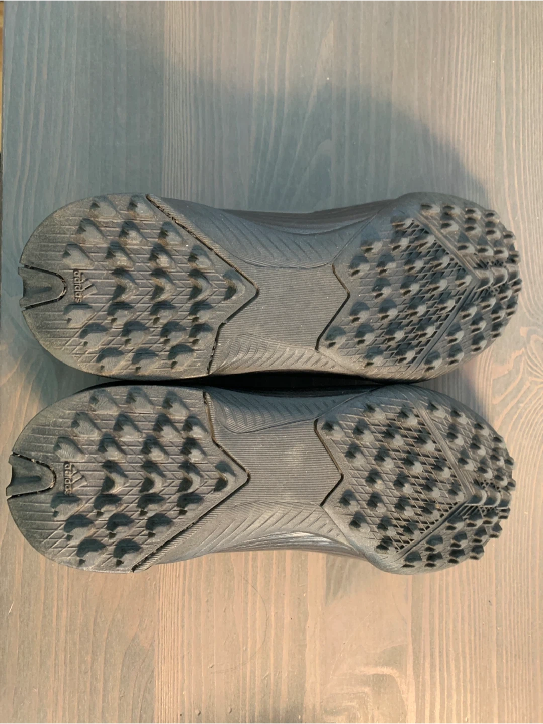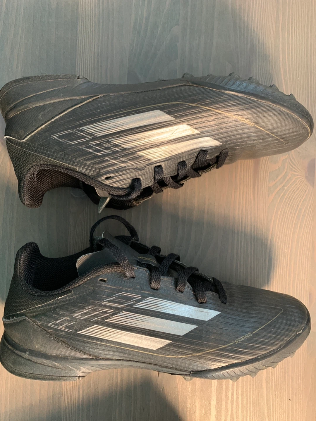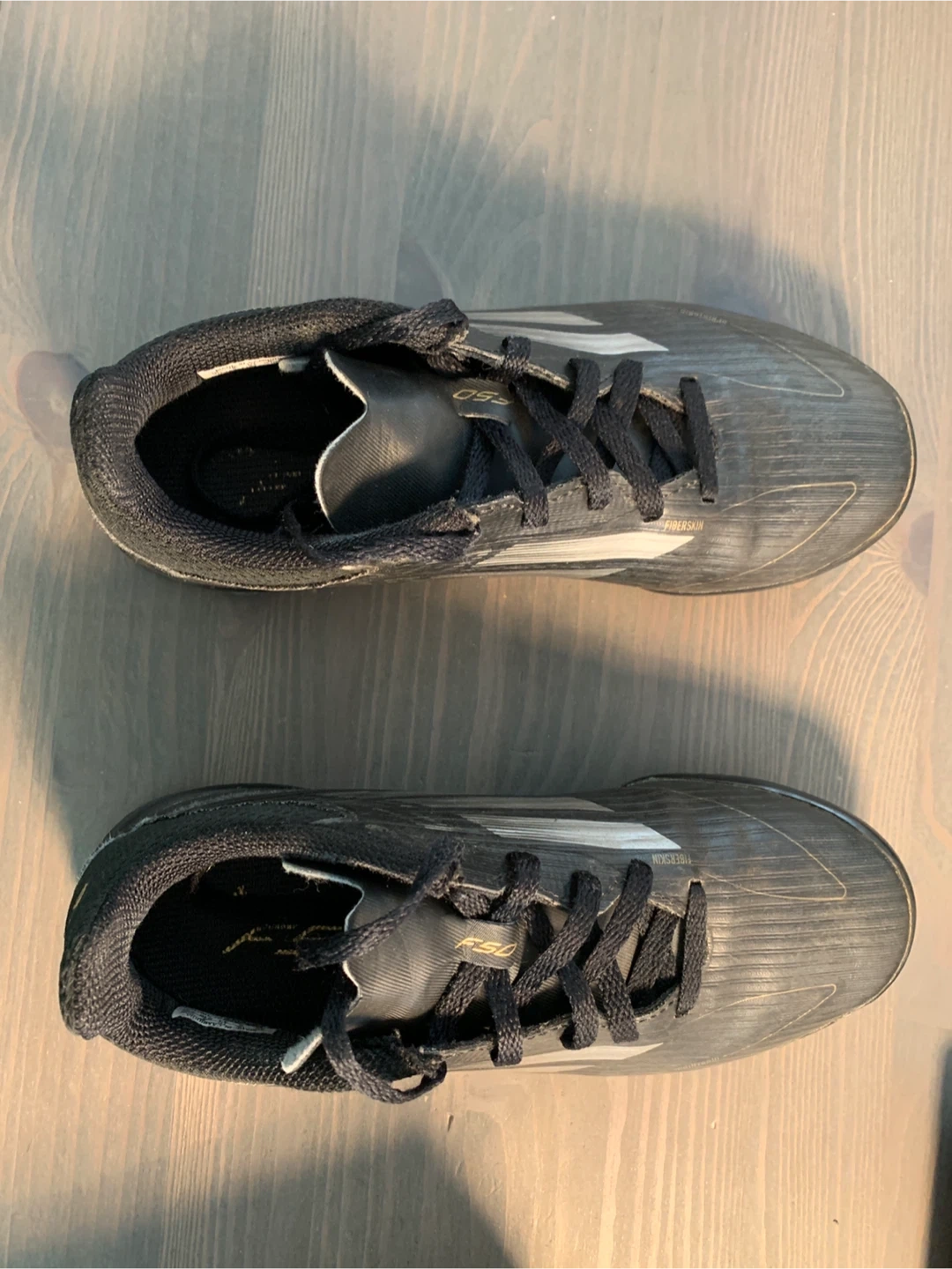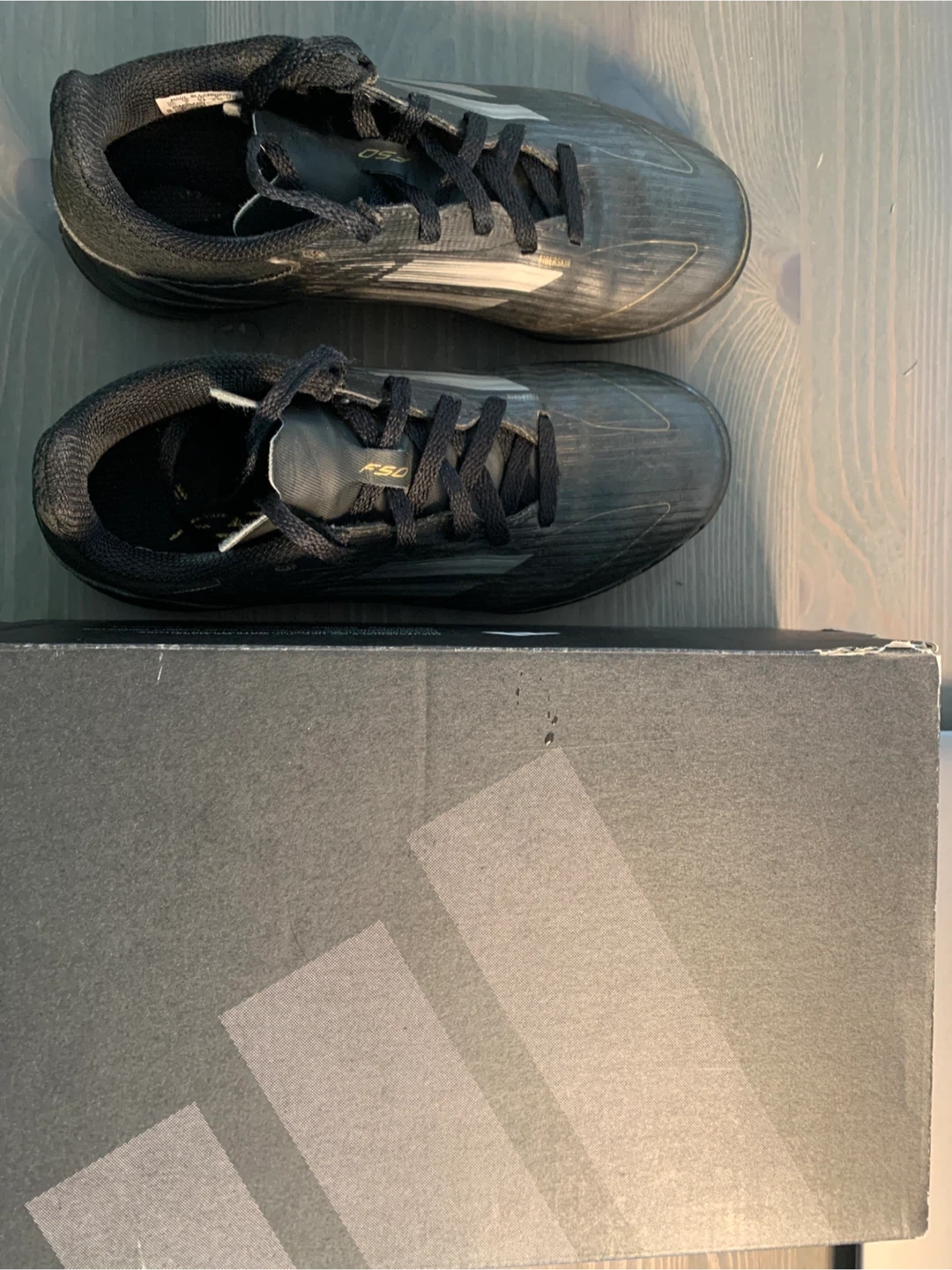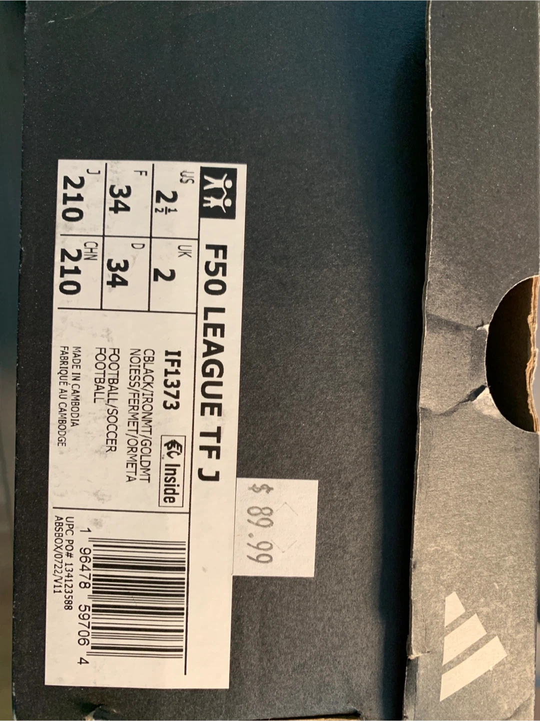 Selling a pair of Adidas F50 League TF J soccer shoes in size US 2.5. They are black with white stripes and come with the original box. The original price was $89.99.