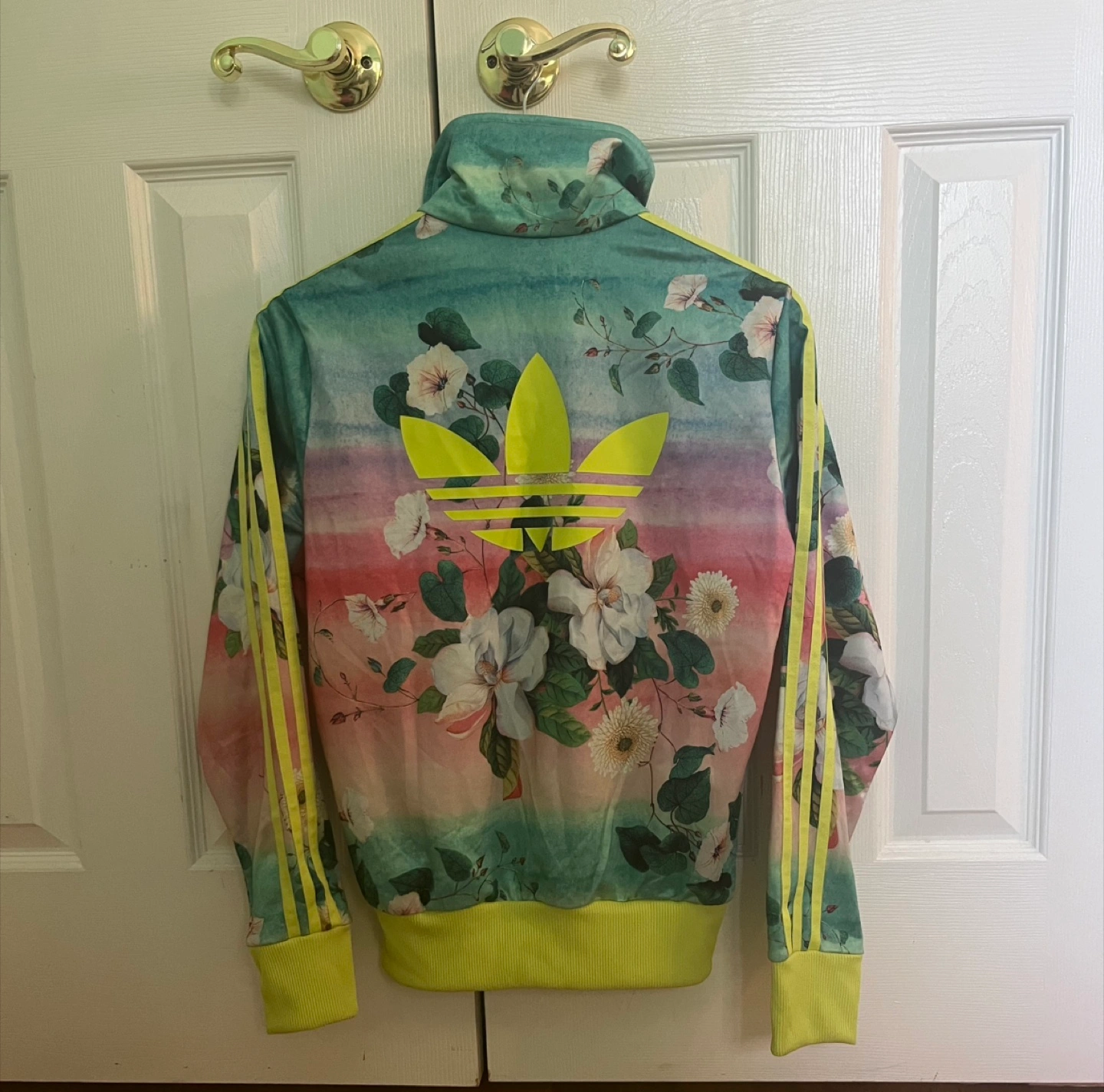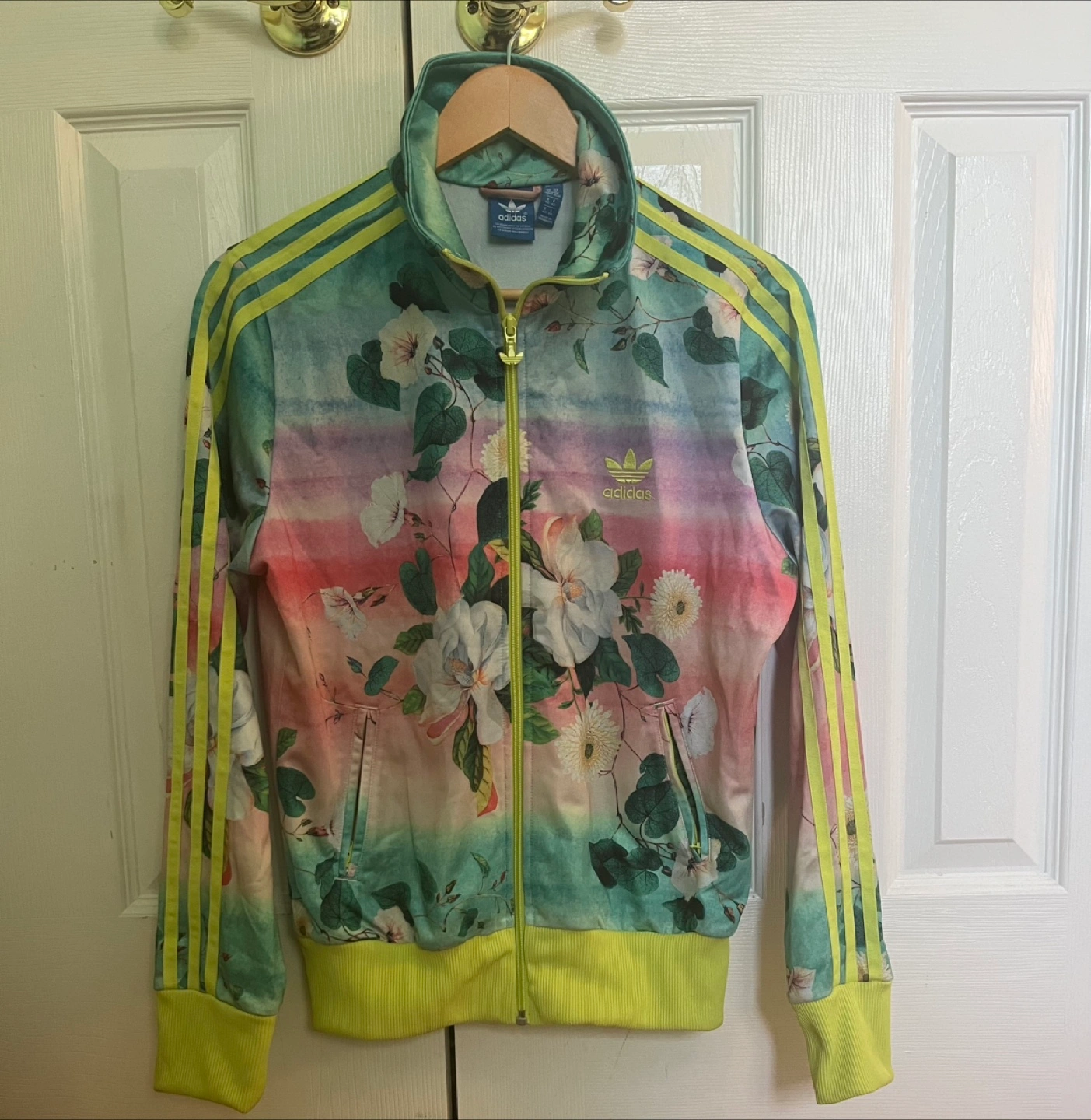 This is a beautiful Adidas Originals Farm Rio Firebird Floralina Sunset Neon Track Jacket! This jacket was part of a limited-edition collaboration between Adidas Originals and The Farm Company, a Brazilian design collective, known for their vibrant and unique prints. The size is Medium . It's in great condition, just a bit wrinkled as you can see in the photos.