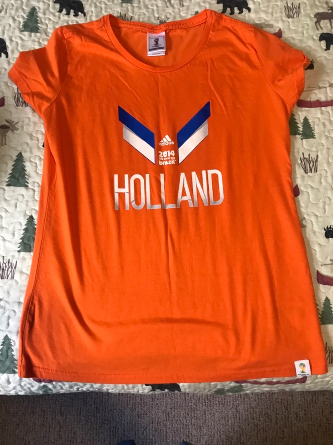 Selling an Adidas Holland 2014 Brazil T-shirt in size M. It's a bright orange colour and made in Canada. Perfect for any soccer fan!