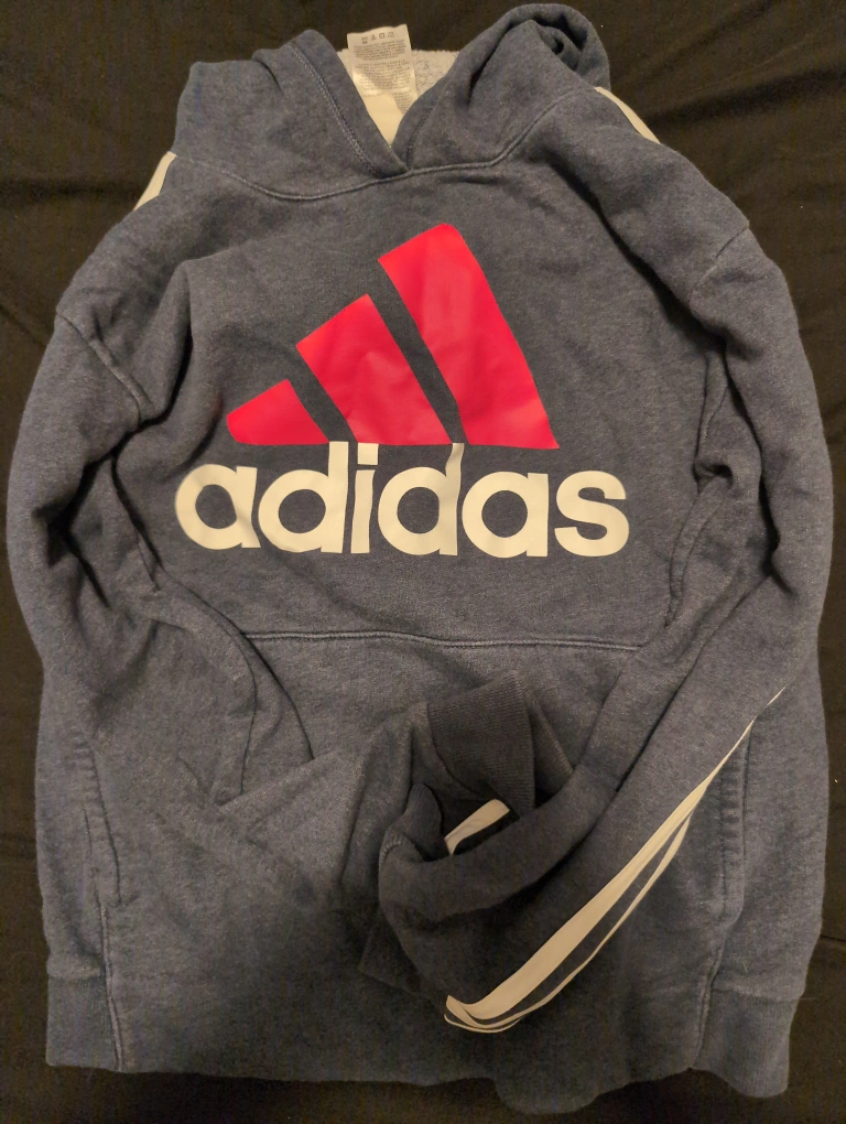 Selling a comfy Adidas hoodie! It's a nice blue colour with a large red Adidas logo on the front. It also features the classic Adidas stripes on the sleeves. 14-16 smoke free home look at my bio. I am selling multiple clothing items for younger boys preteen size. willing to put things in bundles for extremely cheap. just send a message with things that you like and offers
