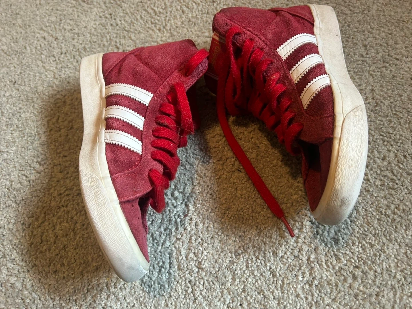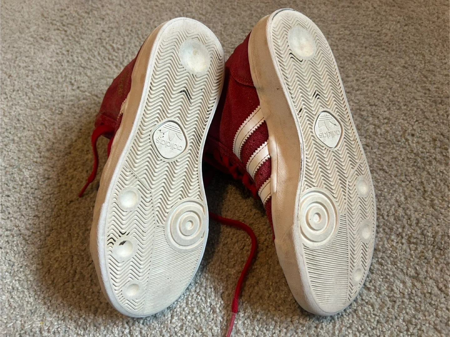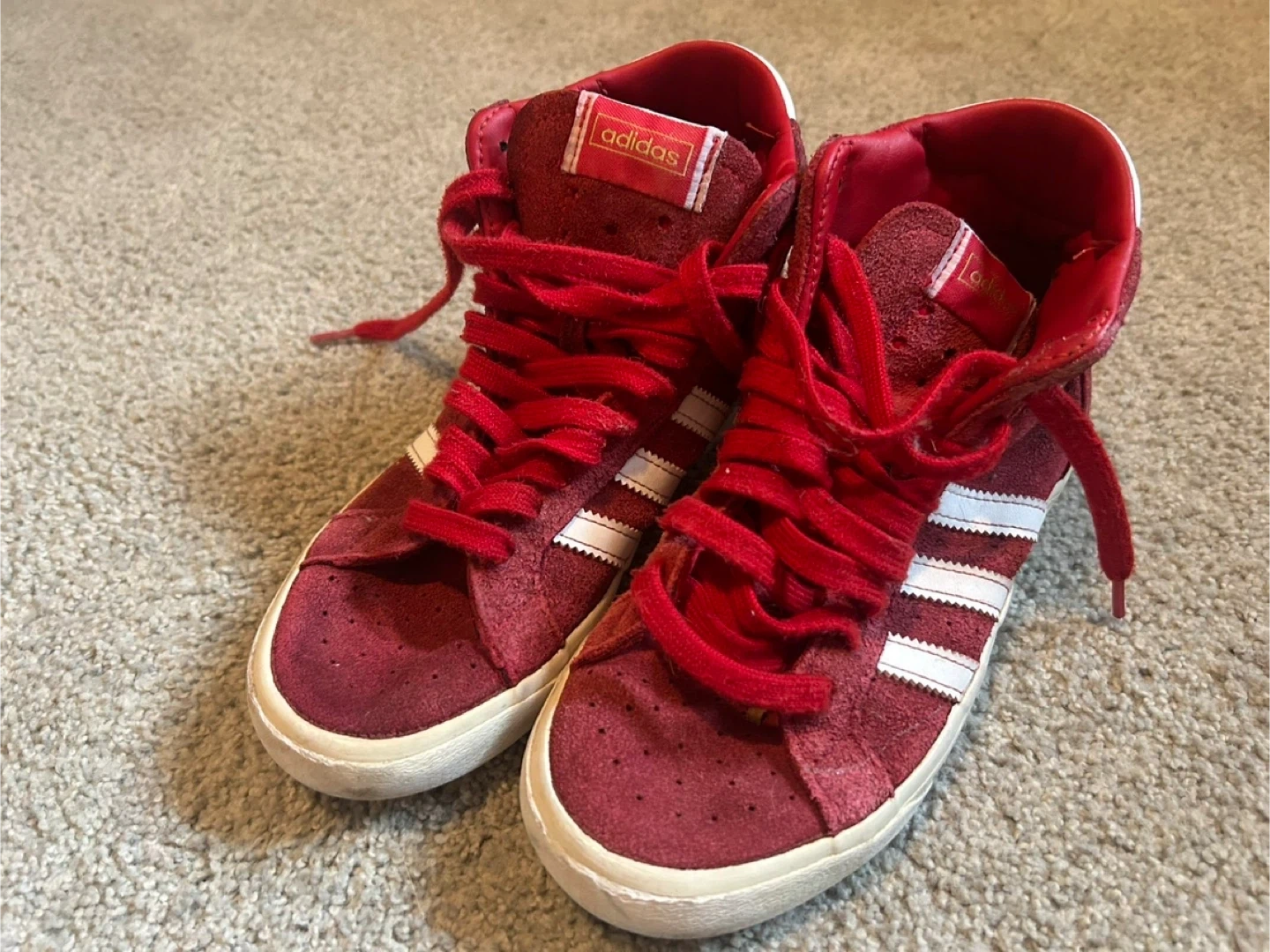 Selling a pair of Adidas Lo Cut sneakers in red suede! They have the classic three stripes in white. The size is US 5.