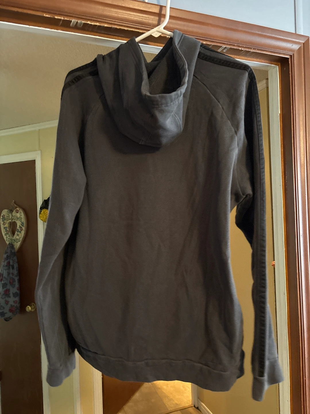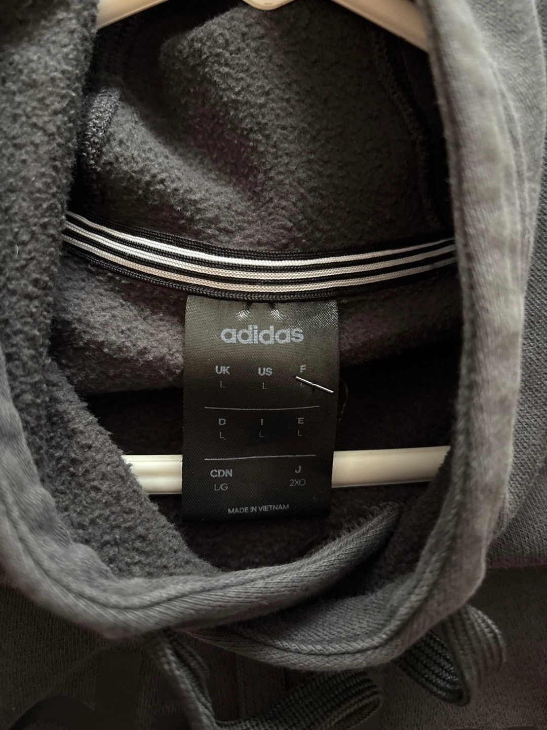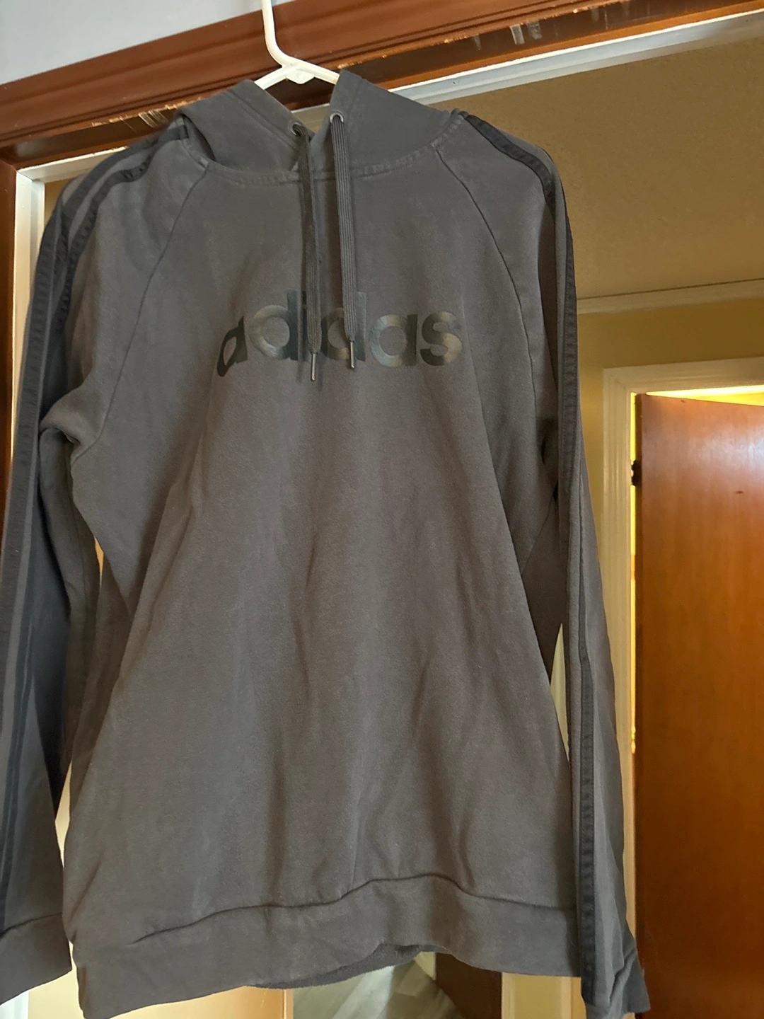 Grey Adidas hoodie. Size large. Features Adidas logo and stripes on sleeves.