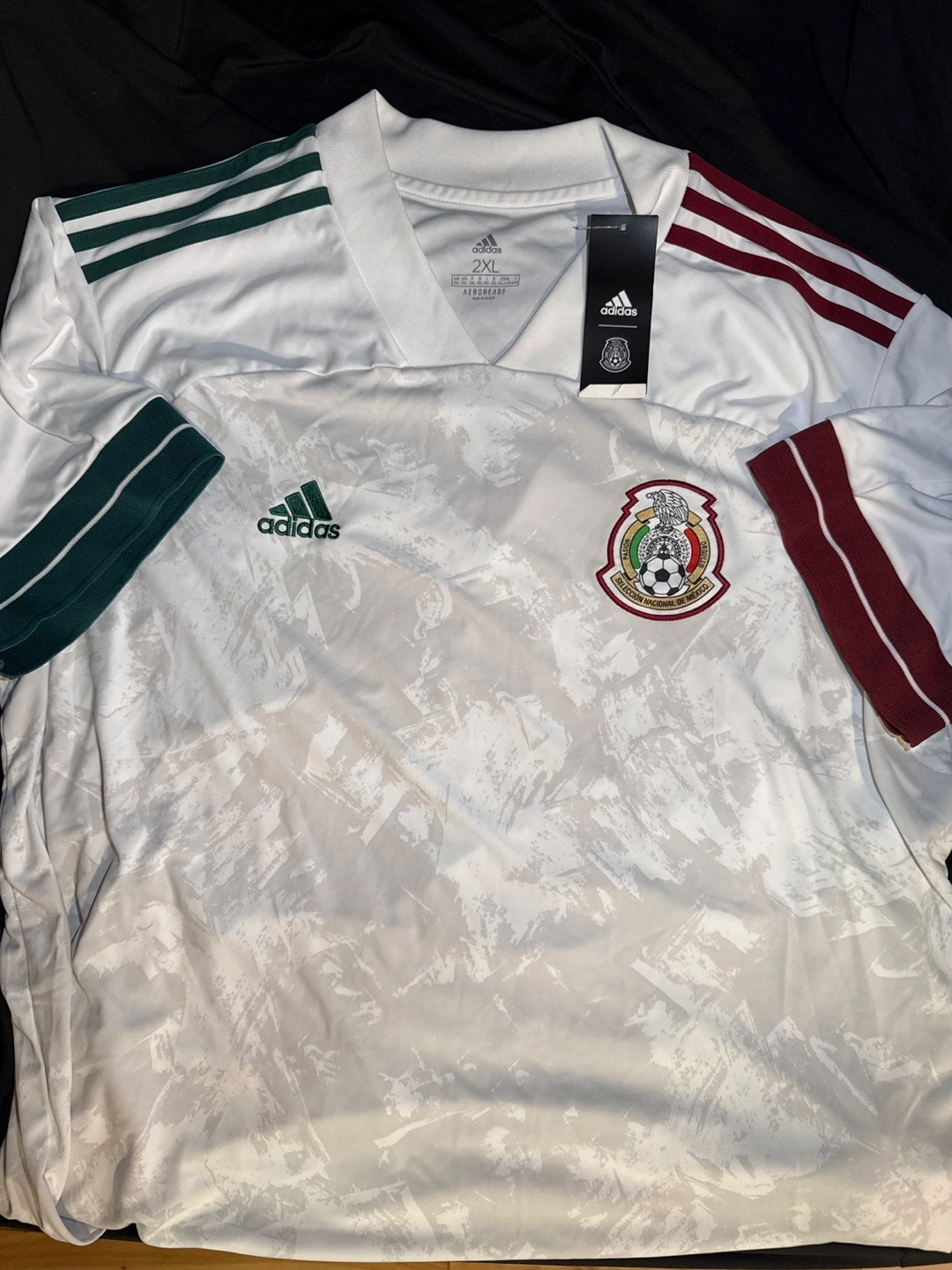 Selling a brand new Adidas Mexico soccer jersey in size 2XL! It's white with the Mexico team logo. The Adidas logo is also visible on the front. This jersey is perfect for showing your support for the team!