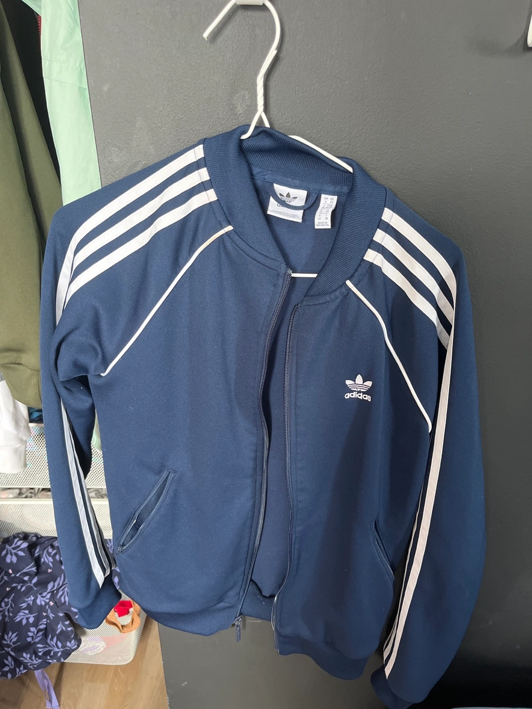Classic Adidas track jacket. Navy blue with white stripes. Full zip. Pockets. Good condition.