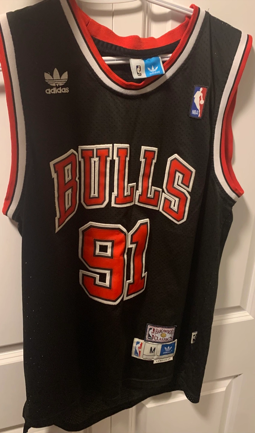 Selling a Vintage 1990s Adidas NBA Bulls Rodman #91 jersey. It's a Hardwood Classics jersey in size M (Medium) with length +2. Great for any Bulls or Rodman fan!