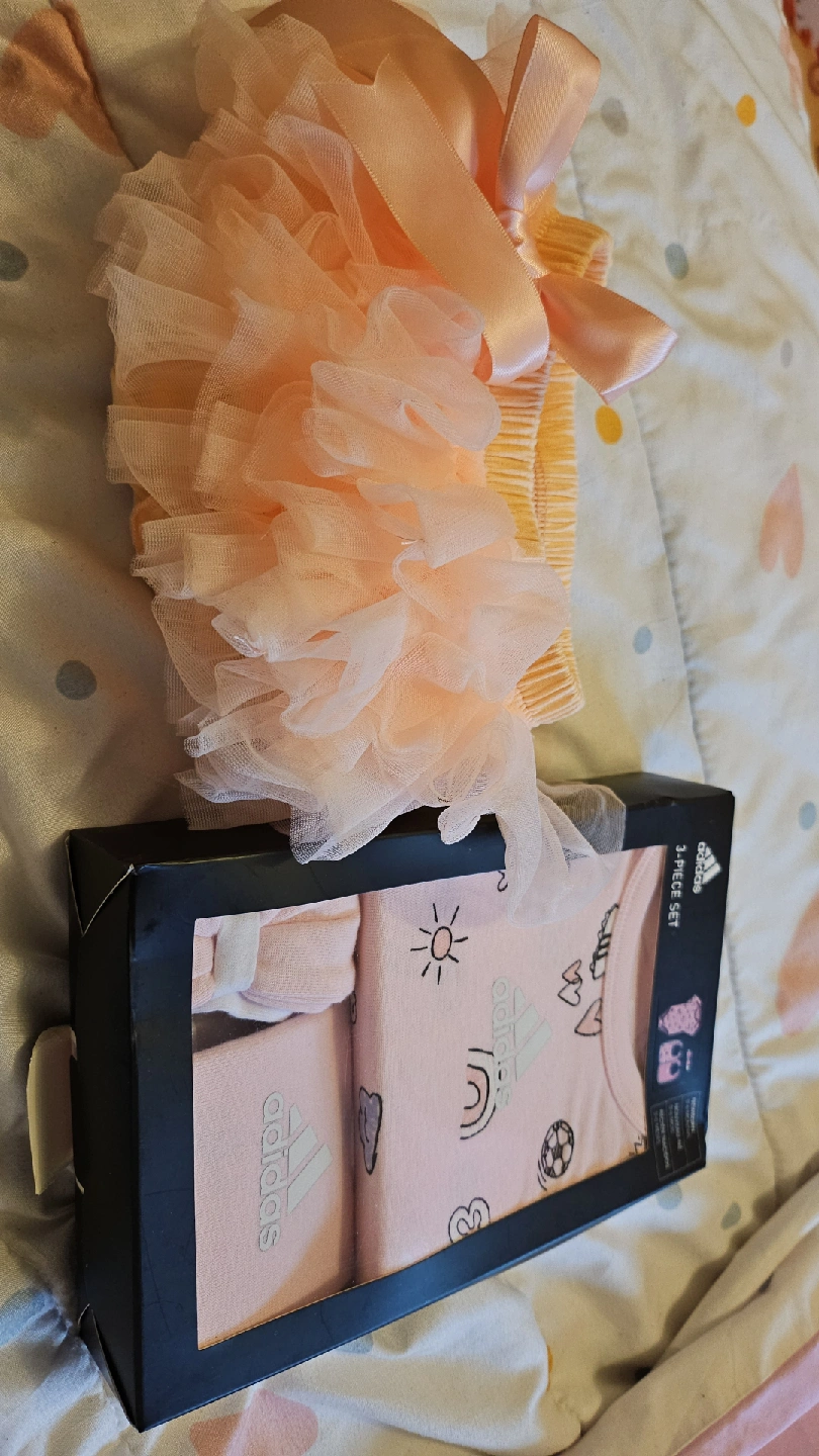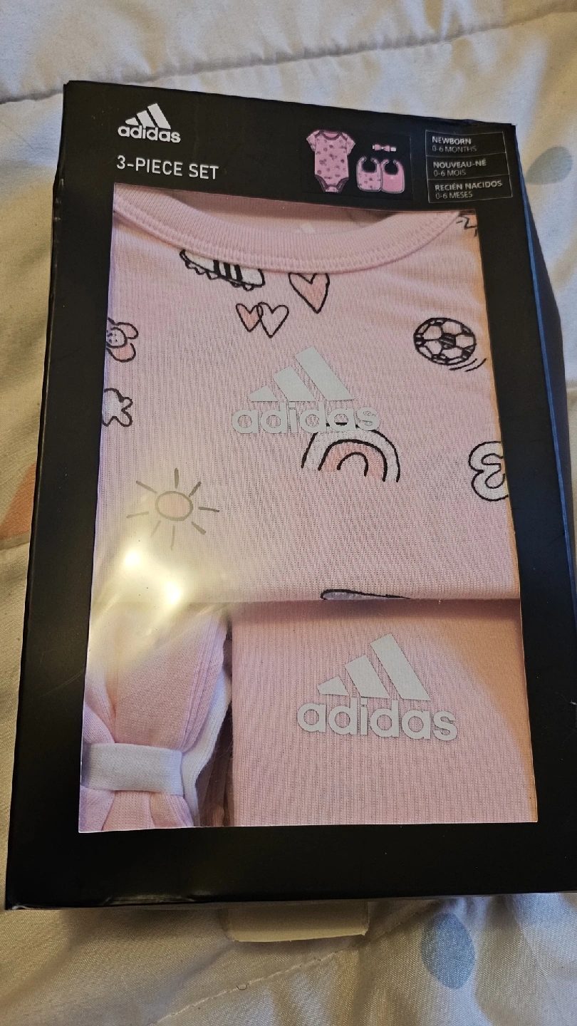 Selling a brand new Adidas 3-piece set for newborns! This adorable set includes a top, booties, and a cute bloomer. The set comes in its original box, perfect for gifting or for your little one!