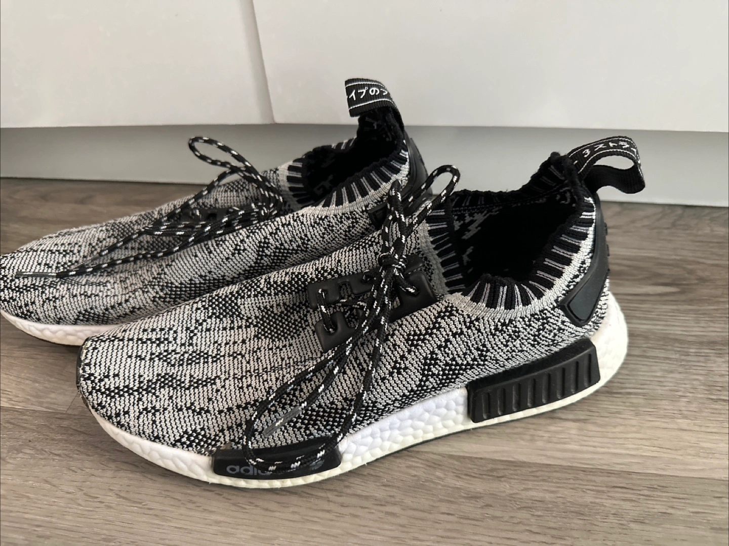 Adidas NMD R1 Primeknit shoes in a cool grey and black pattern! These sneakers are known for their comfortable Primeknit upper and responsive Boost midsole. Perfect for everyday wear or light workouts