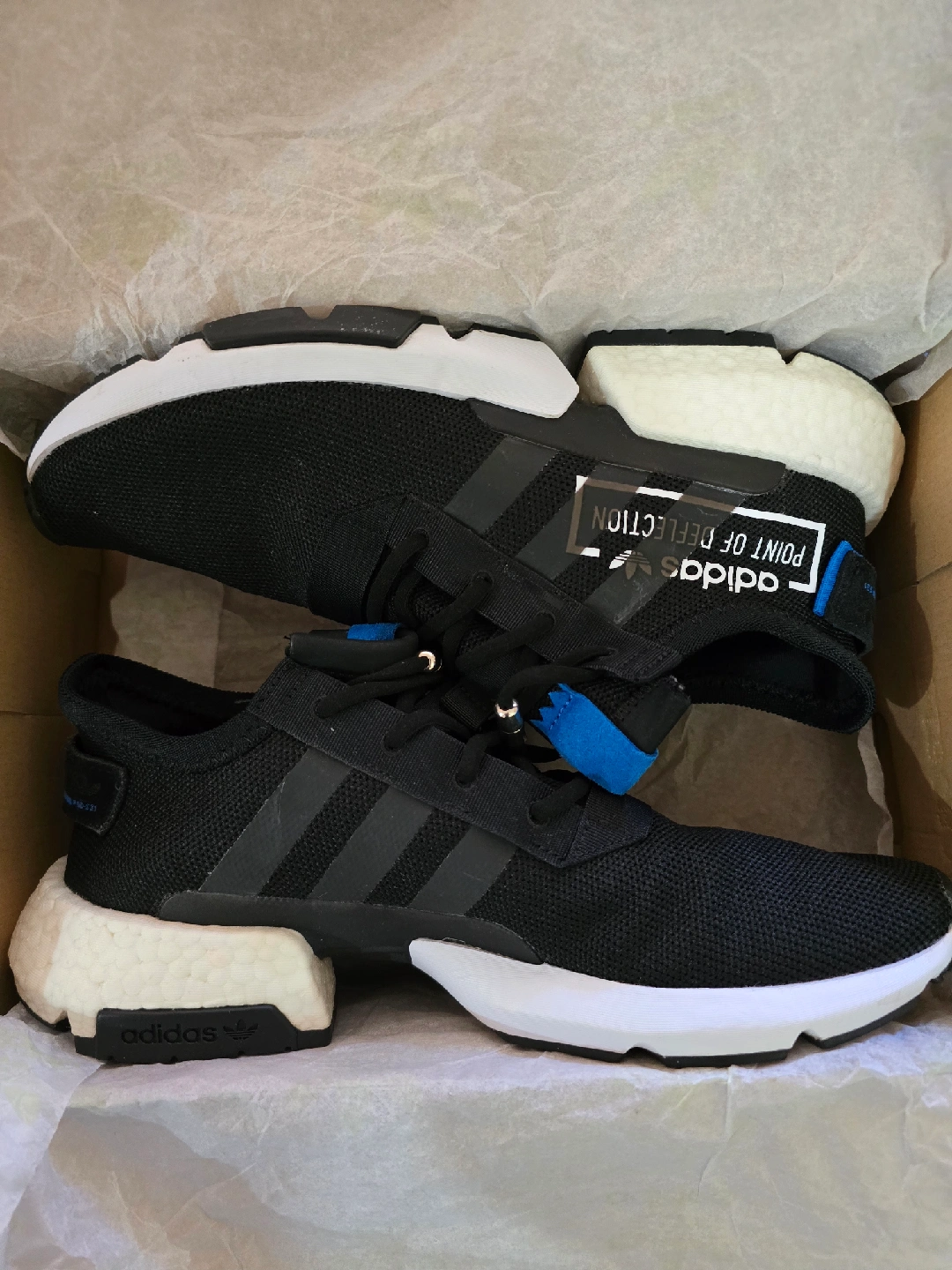 Selling a pair of Adidas POD-S3.1 sneakers in black, size US 9.5 used for 3 to 4 times. They come with the original box. These sneakers feature a unique design with a distinctive sole. Great for everyday wear!