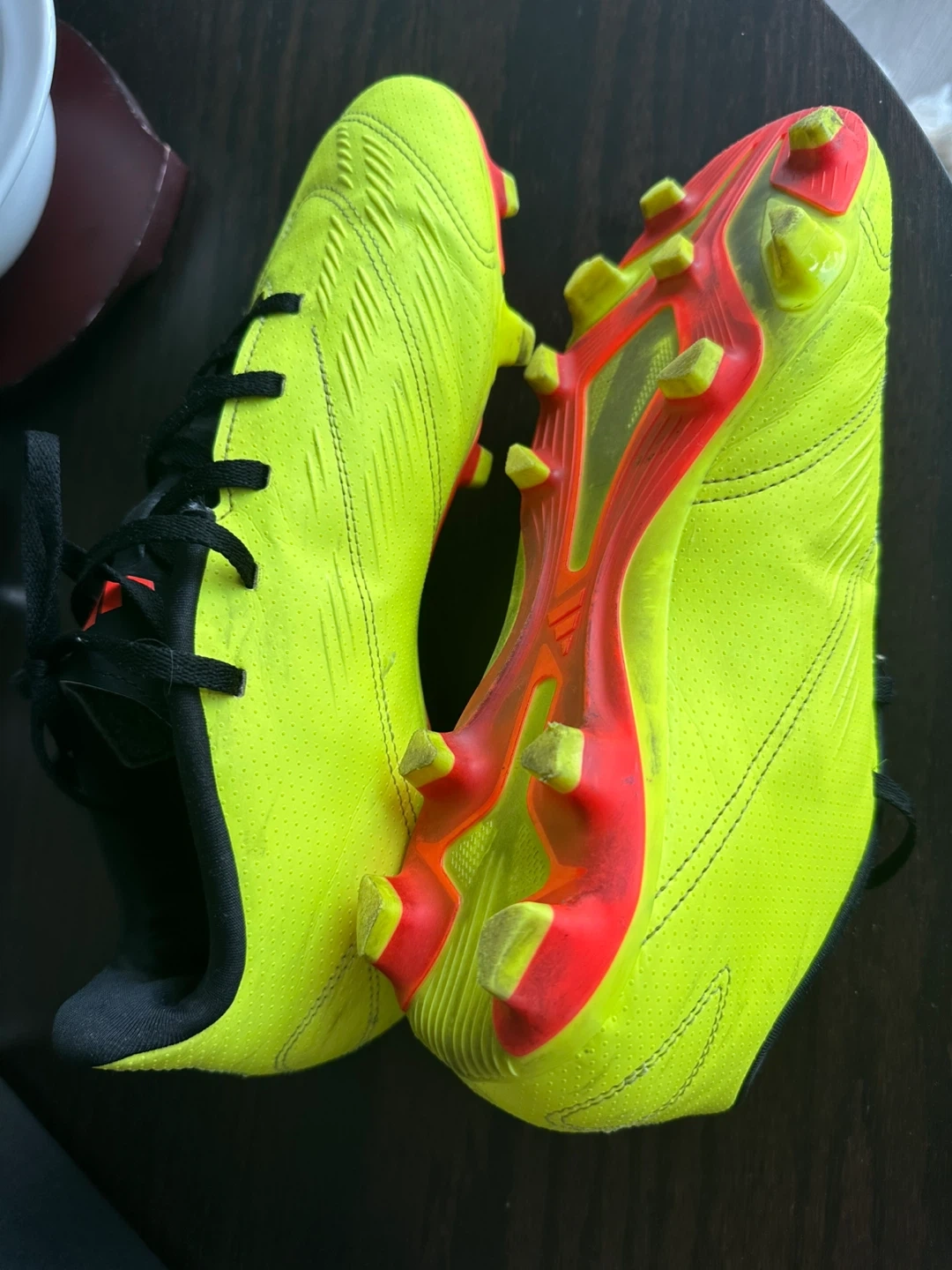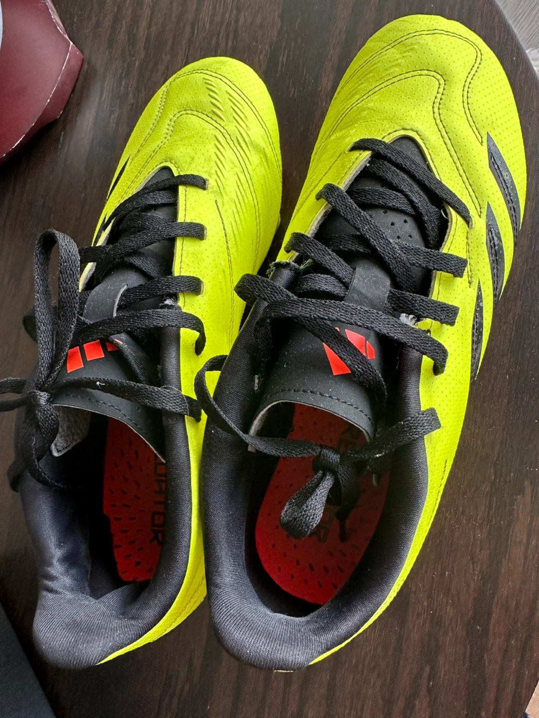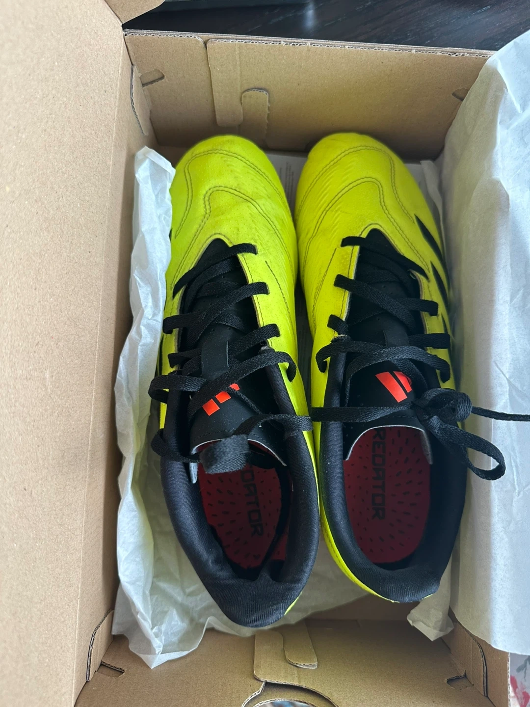 Selling a pair of Adidas Predator soccer cleats in size 8.5 US. They are a vibrant yellow colour with black accents.