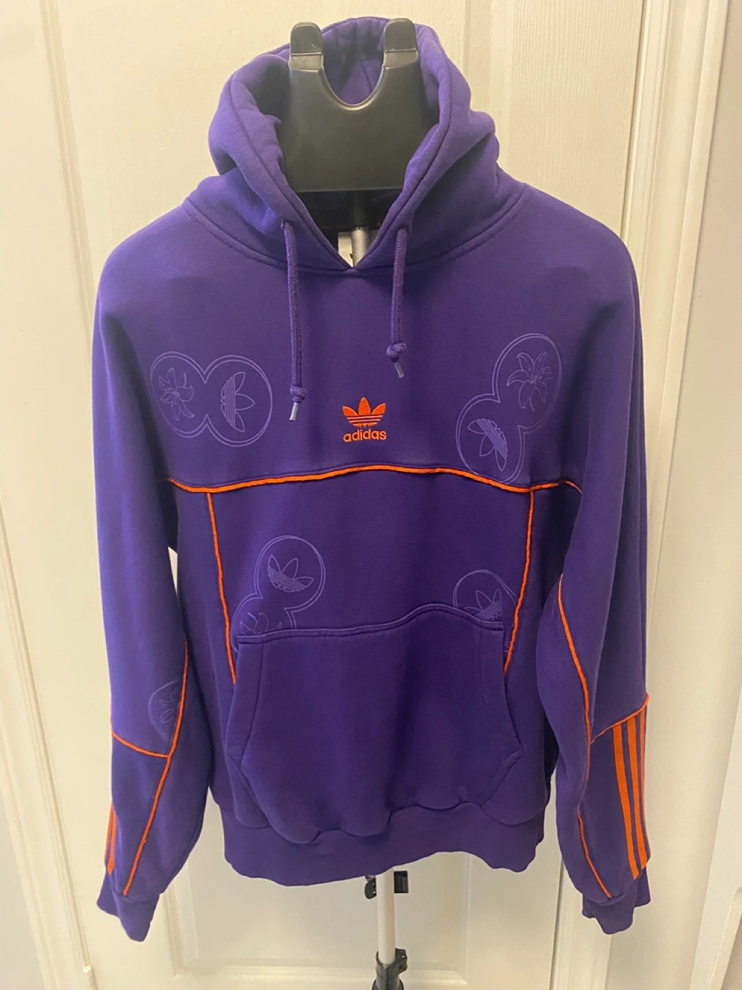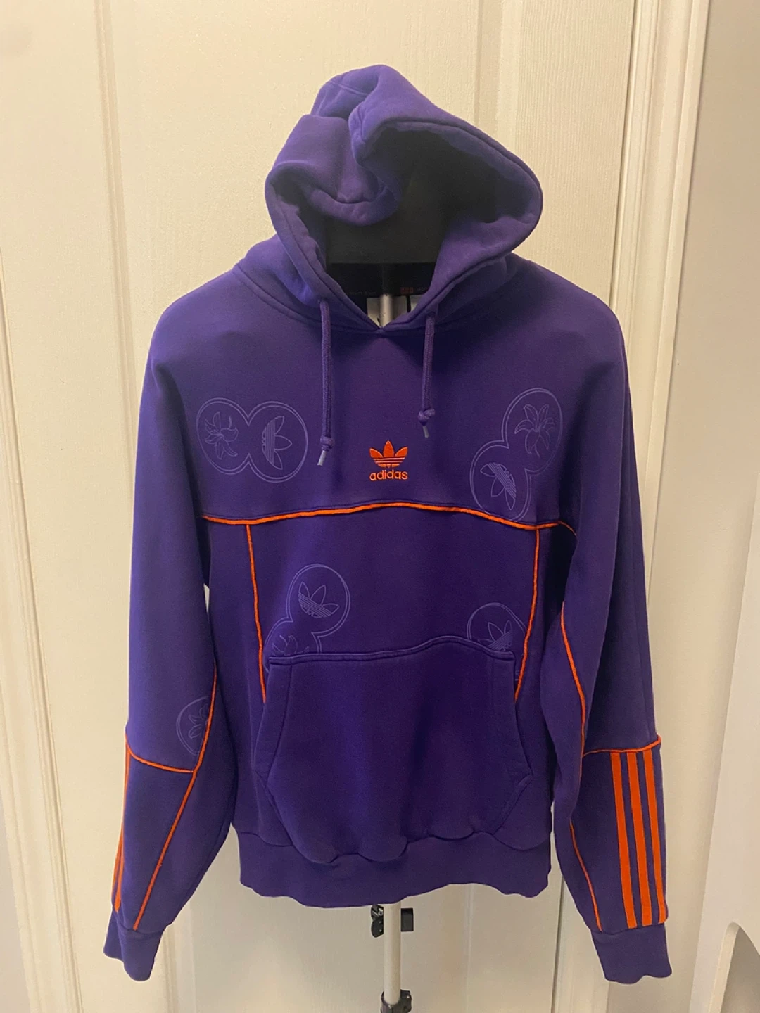 Selling a stylish Adidas hoodie in a vibrant purple colour! It features orange accents and a unique design. Perfect for adding a pop of colour to your wardrobe and staying comfy