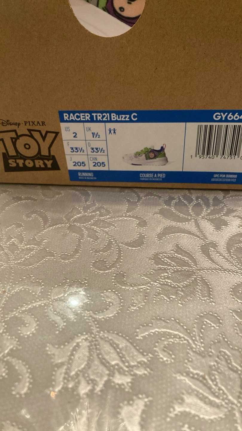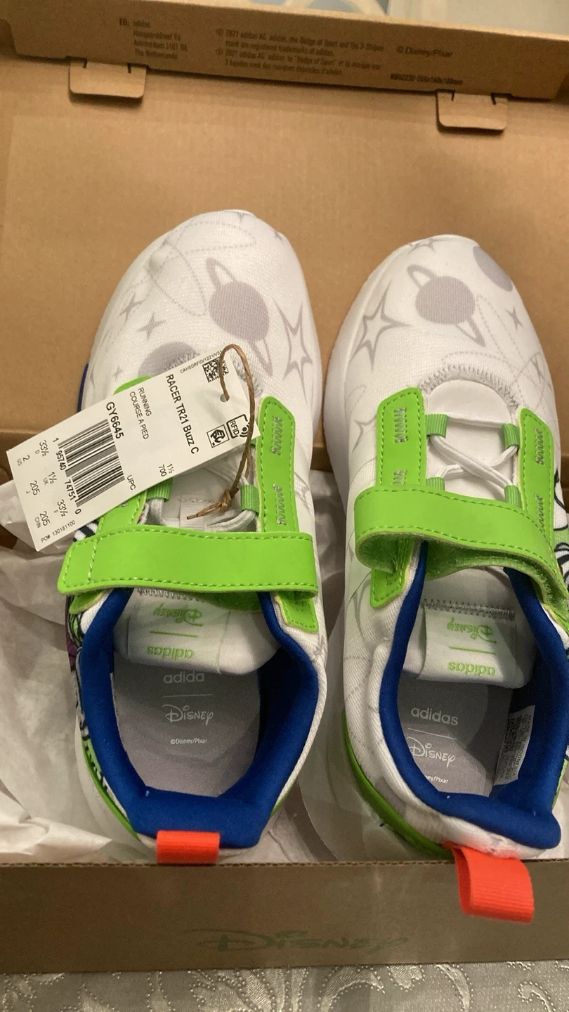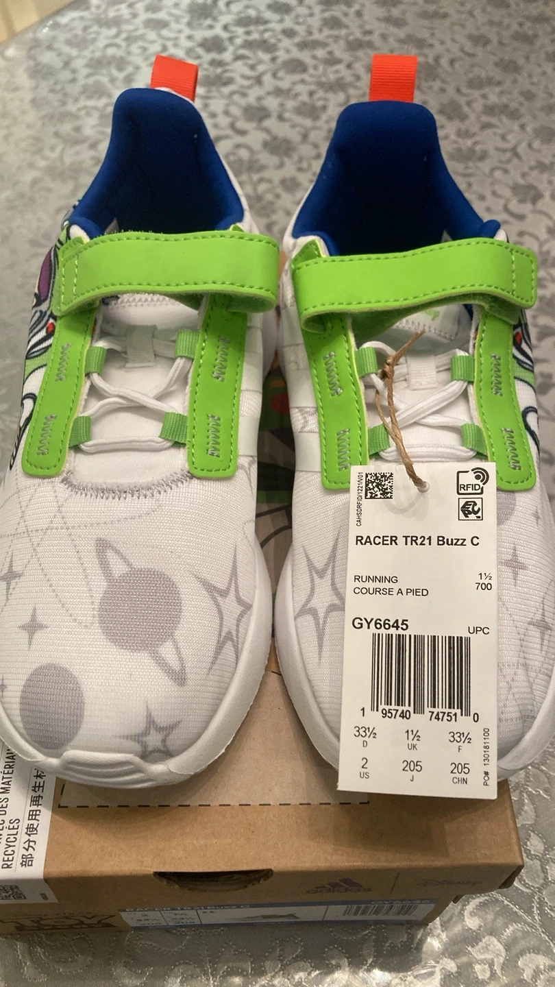These Adidas Racer TR21 Buzz C running shoes are perfect for your little one! They feature a fun Toy Story design with Buzz Lightyear. - Brand: Adidas - Model: Racer TR21 Buzz C - Size: 2 US and size 3US - Colour: White with green and blue accents - Running shoes designed for kids