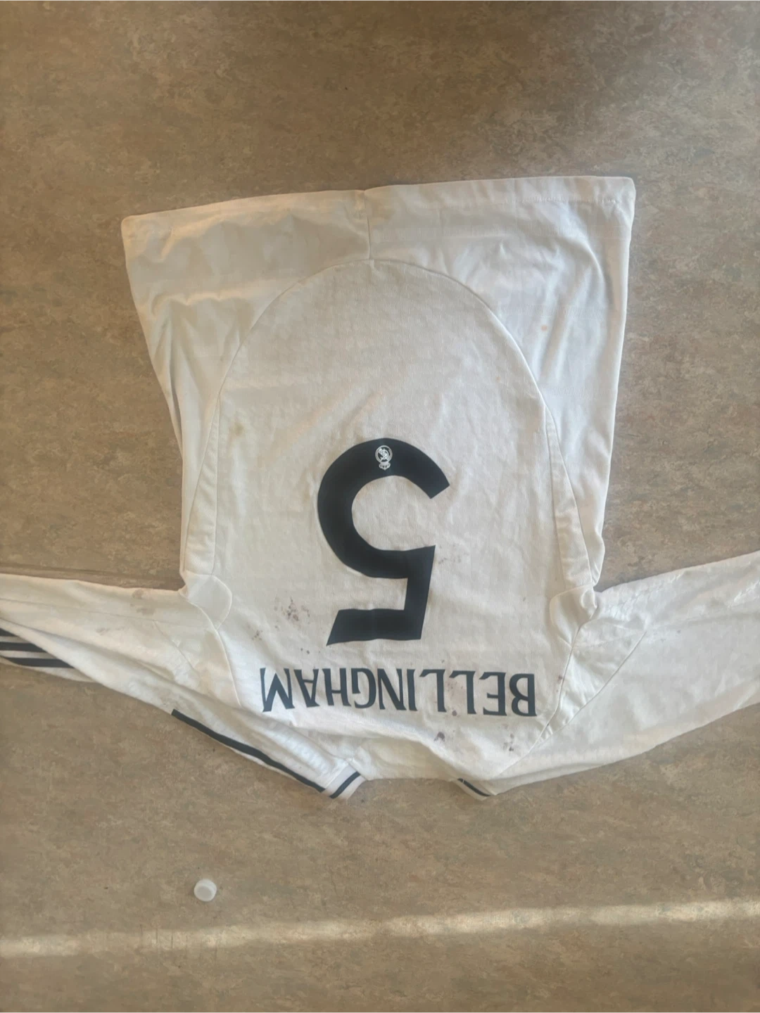Selling an Adidas Real Madrid long-sleeve jersey with Bellingham #5 on the back. The jersey is white with the Emirates Fly Better logo on the front. It also features Adidas' HEAT.RDY technology. Size m