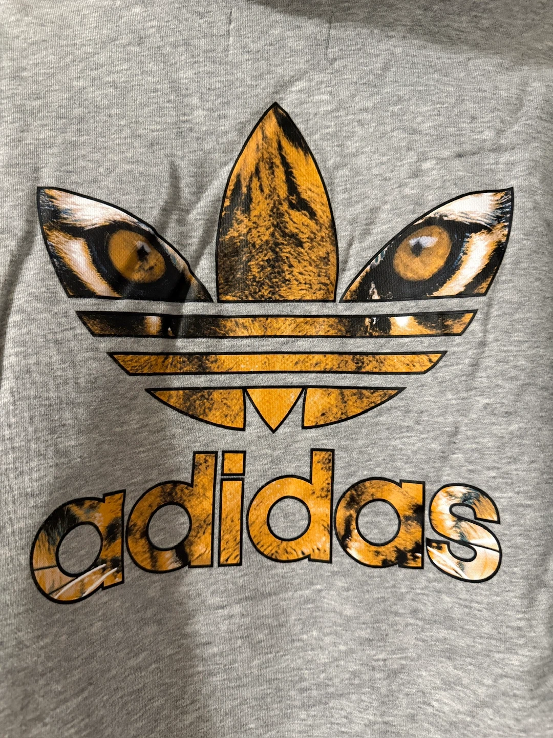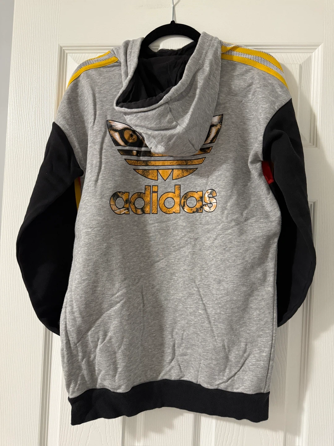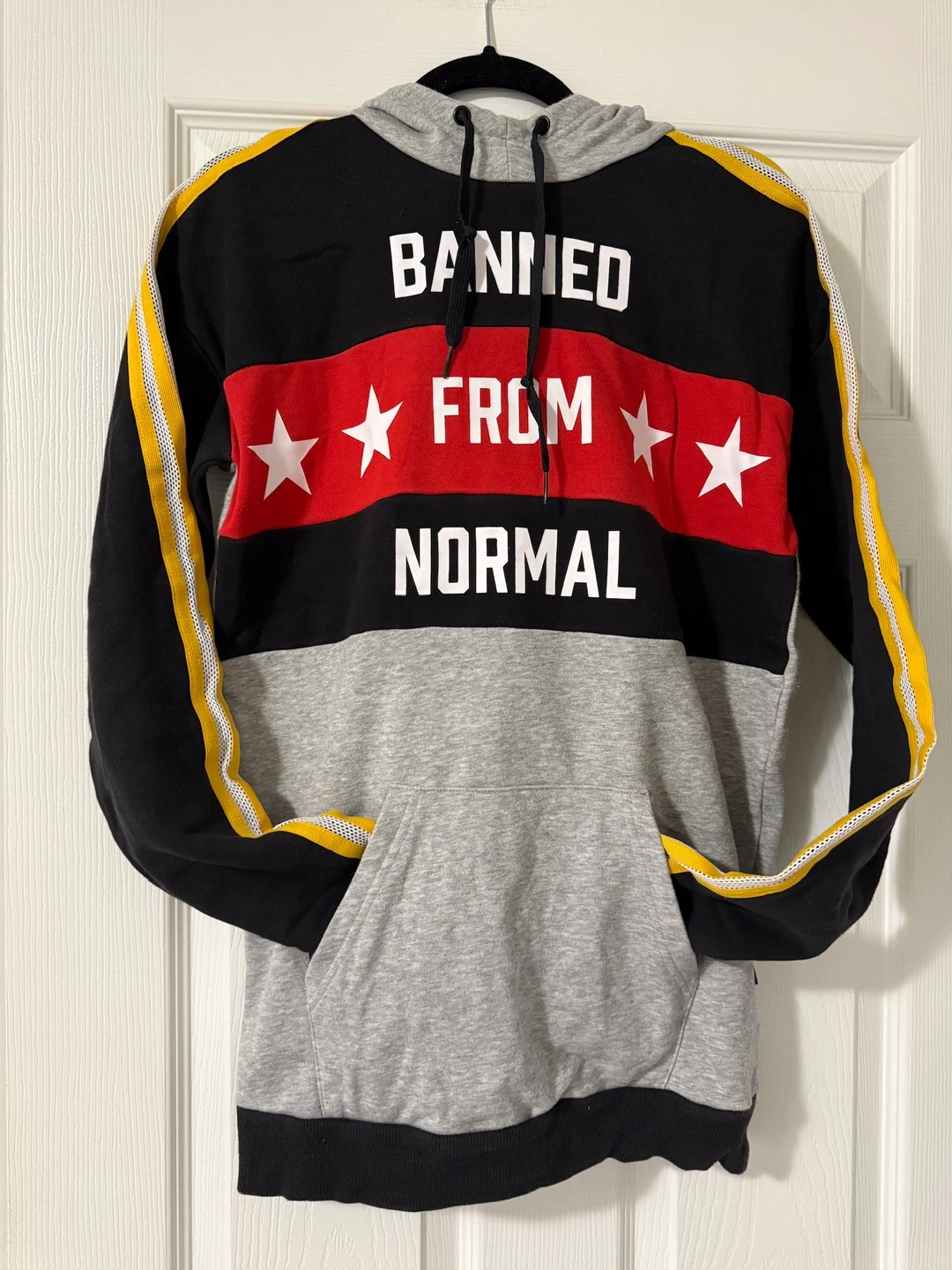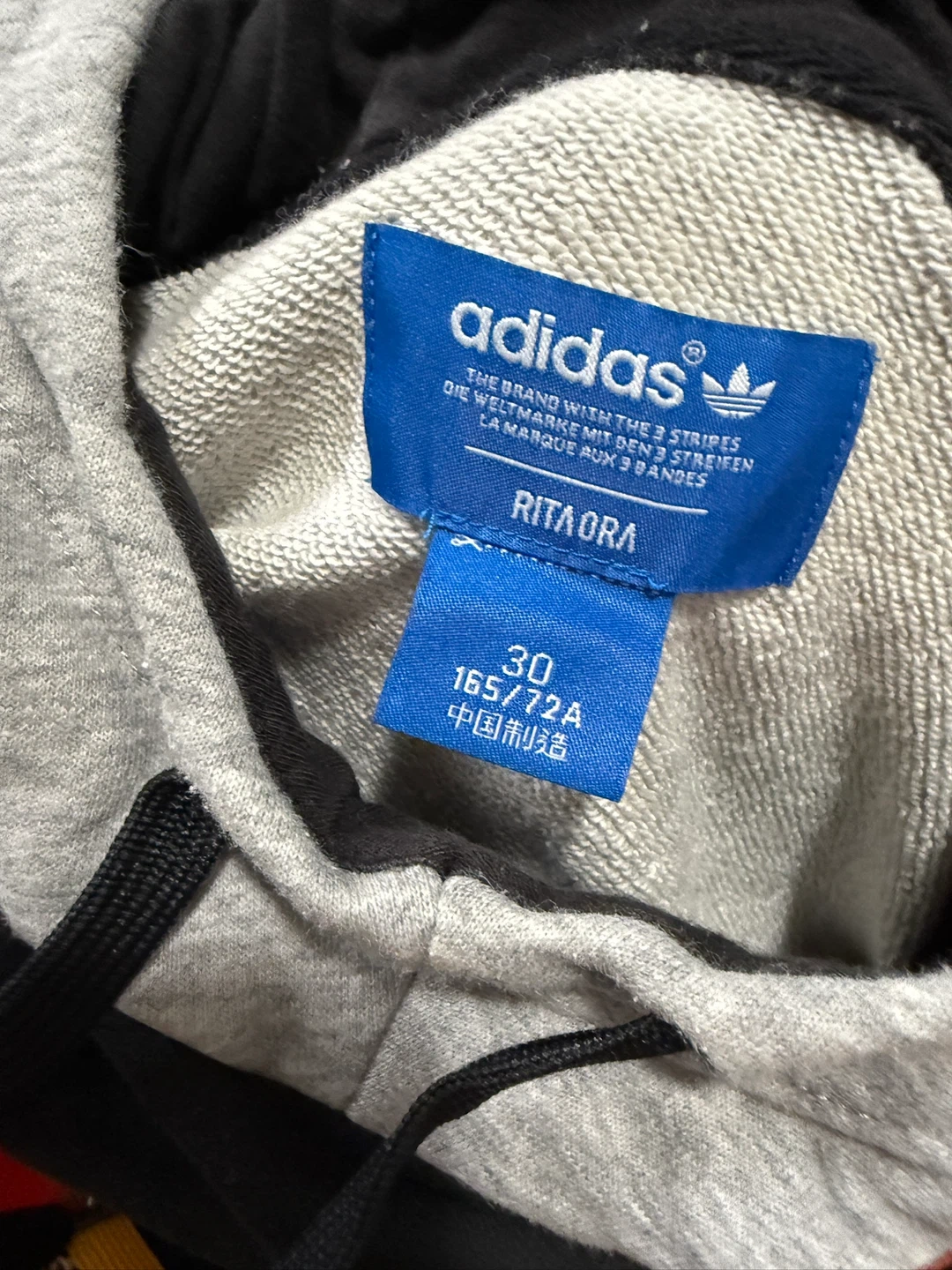 Selling an Adidas Rita Ora hoodie. It features a unique design with "Banned From Normal" text and stars on the front. The back has the Adidas logo with a tiger-eye design. Size 30.