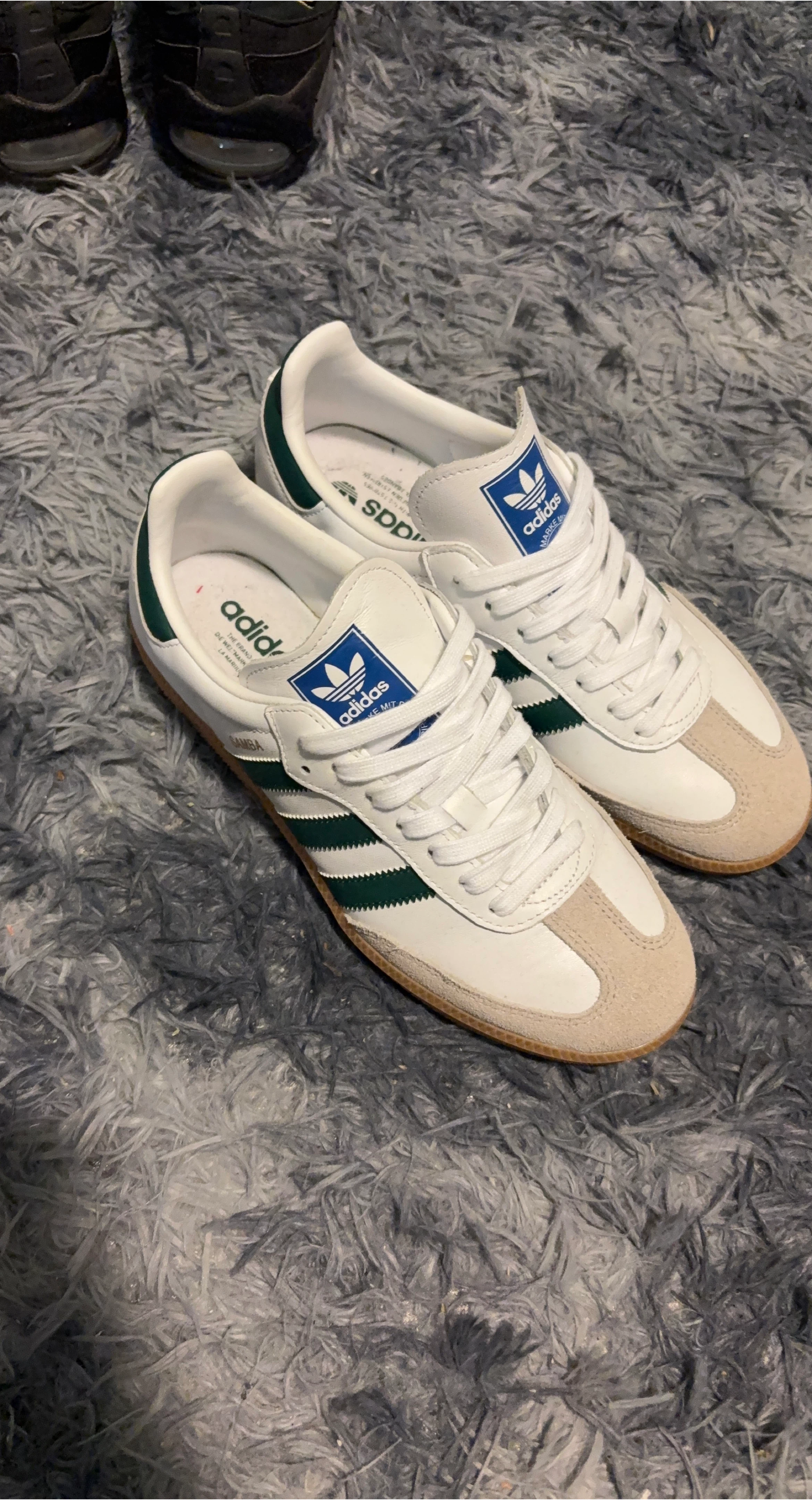 Selling a pair of Adidas Samba sneakers! They're white with green stripes and the classic Adidas logo. These are in great shape and ready for a new home. Comes with original box