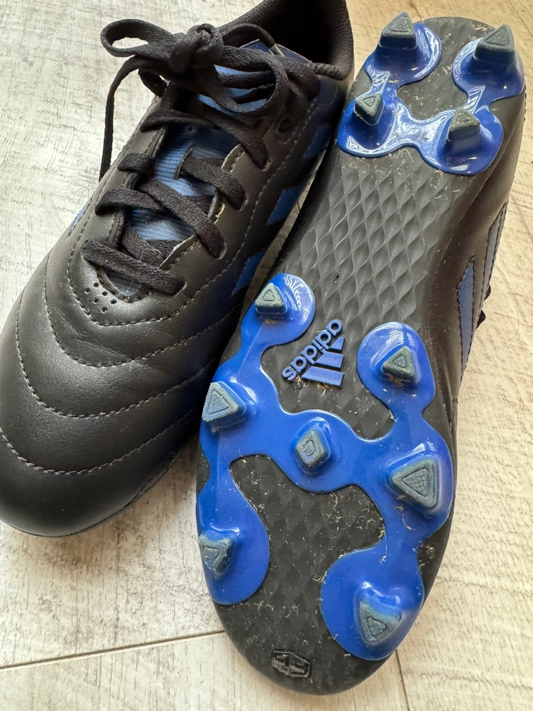 Selling a pair of Adidas soccer cleats for youth. They're black with blue accents and in used condition. Great for getting your little one on the field!