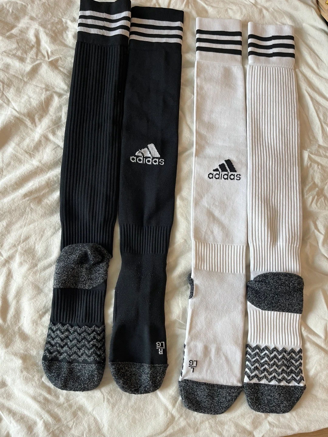 Selling 2 pairs of Adidas soccer socks. There are one pairs in black and one pairs in white. Size LG.