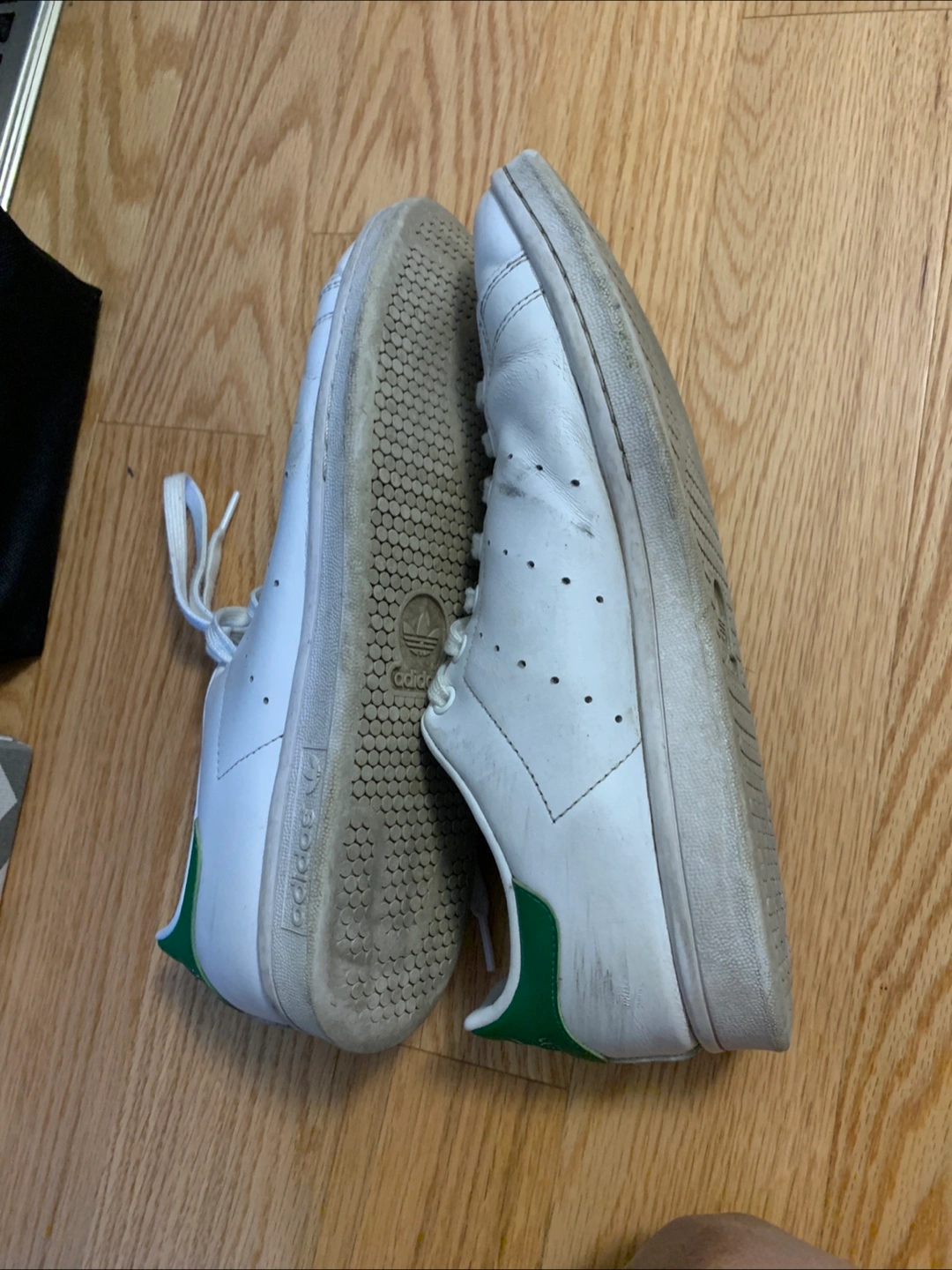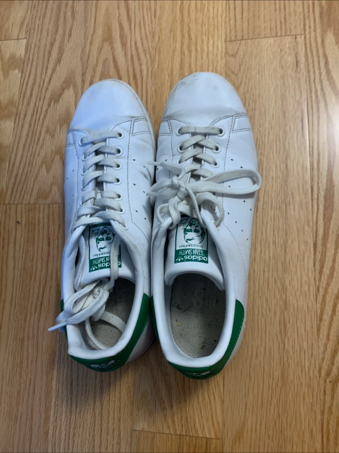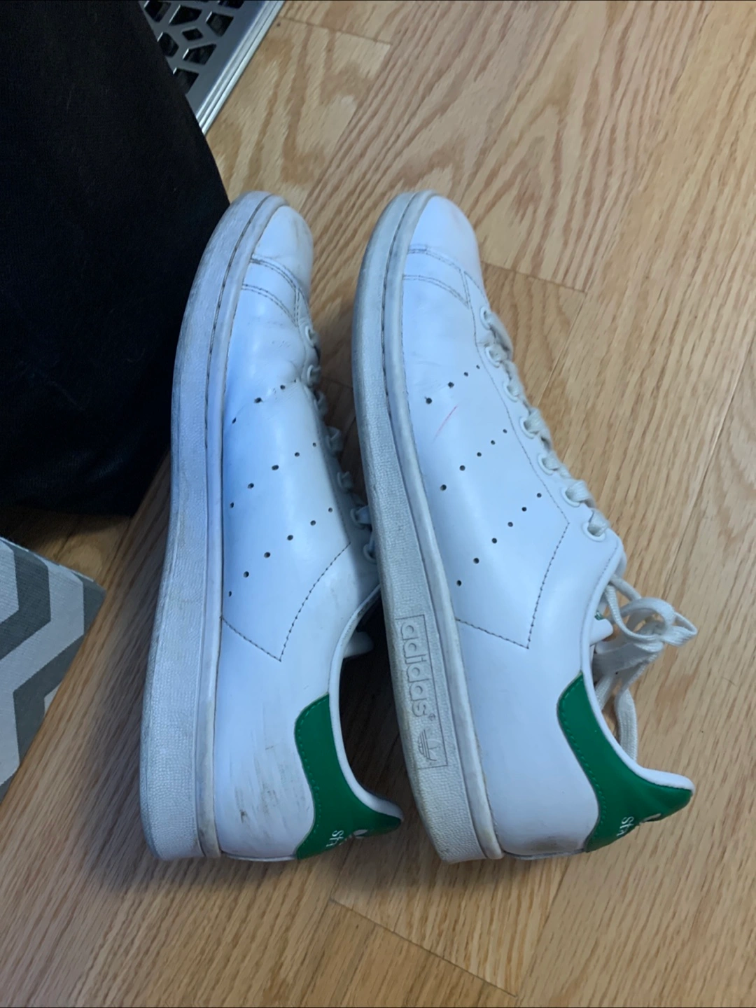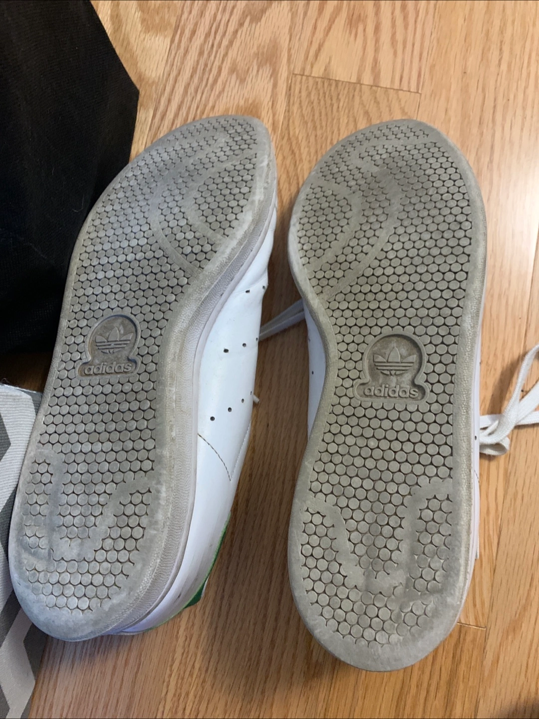 Selling a pair of Adidas Stan Smith sneakers in white with green accents! They're in used condition, as you can see from the photos, but still have lots of life left. Classic and comfy kicks!