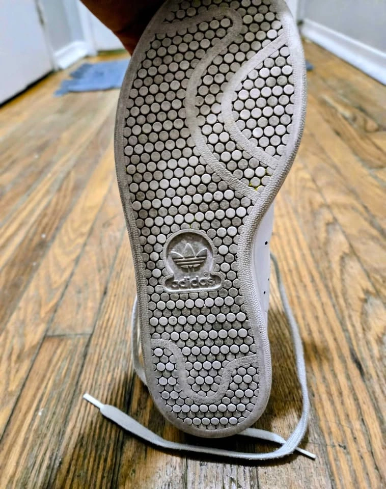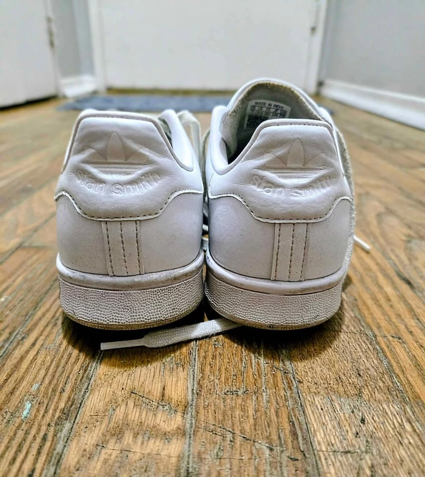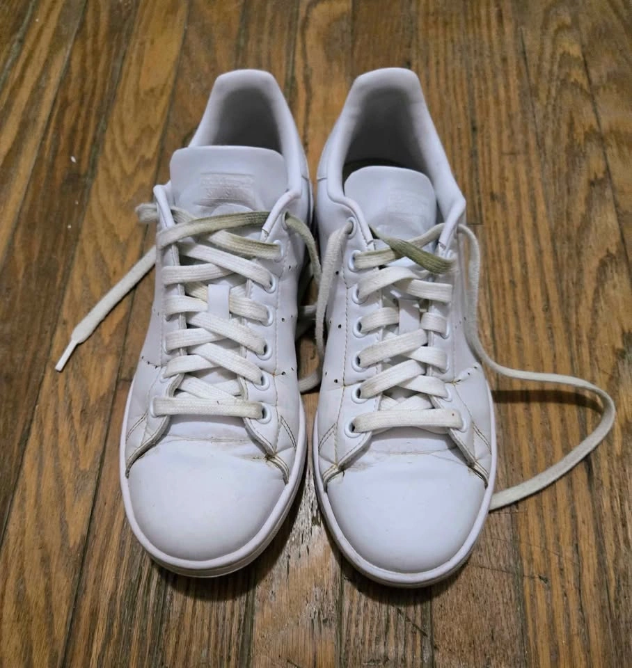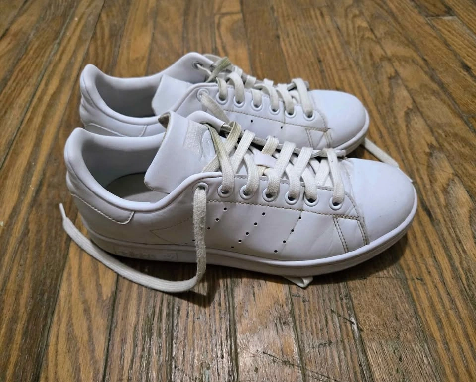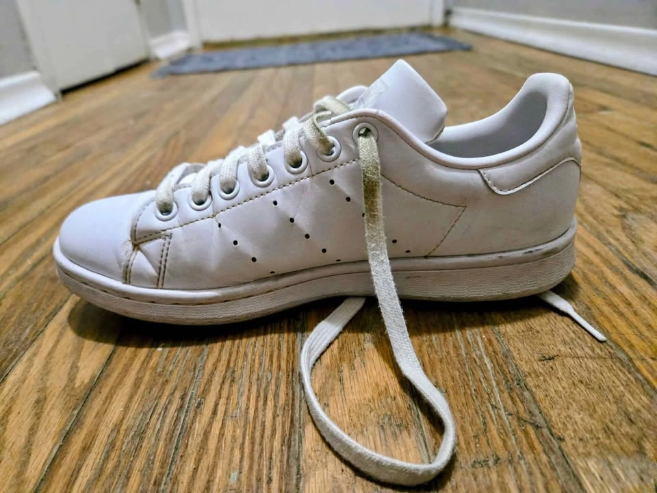 ADIDAS Stan Smith Womens Shoes - Cloud White - Size 8 - Great condition (aside from need a good wash)** SOLD OUT ONLINE** retail at $130 +tax** Timeless sneakers made with recycled materials. (From the makers): "For 50 years, the adidas Stan Smith Shoes have been a staple on the courts and on the streets. Their minimalist style is the very definition of effortless cool. But even icons have to change to stay rooted in the present, which is why this version of the trainers is created with recycled materials. It's part of our effort and commitment to help end plastic waste. This product is made with Primegreen, a series of high-performance recycled materials. 50% of upper is recycled content. No virgin polyester." Great condition aside from they just need a good wash. Tread is in excellent condition.