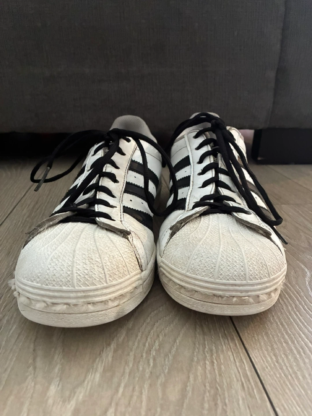 Selling a pair of Adidas Superstar sneakers! They show some signs of wear, as you can see in the pictures. Still lots of life left in them for casual wear or a retro look! Classic black and white design.