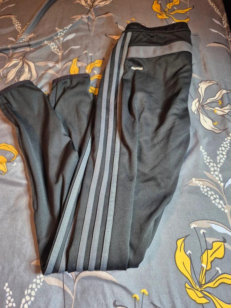 Offering these gray track pants. Features grey stripes on the side of the legs. A great option for an afternoon walk.
